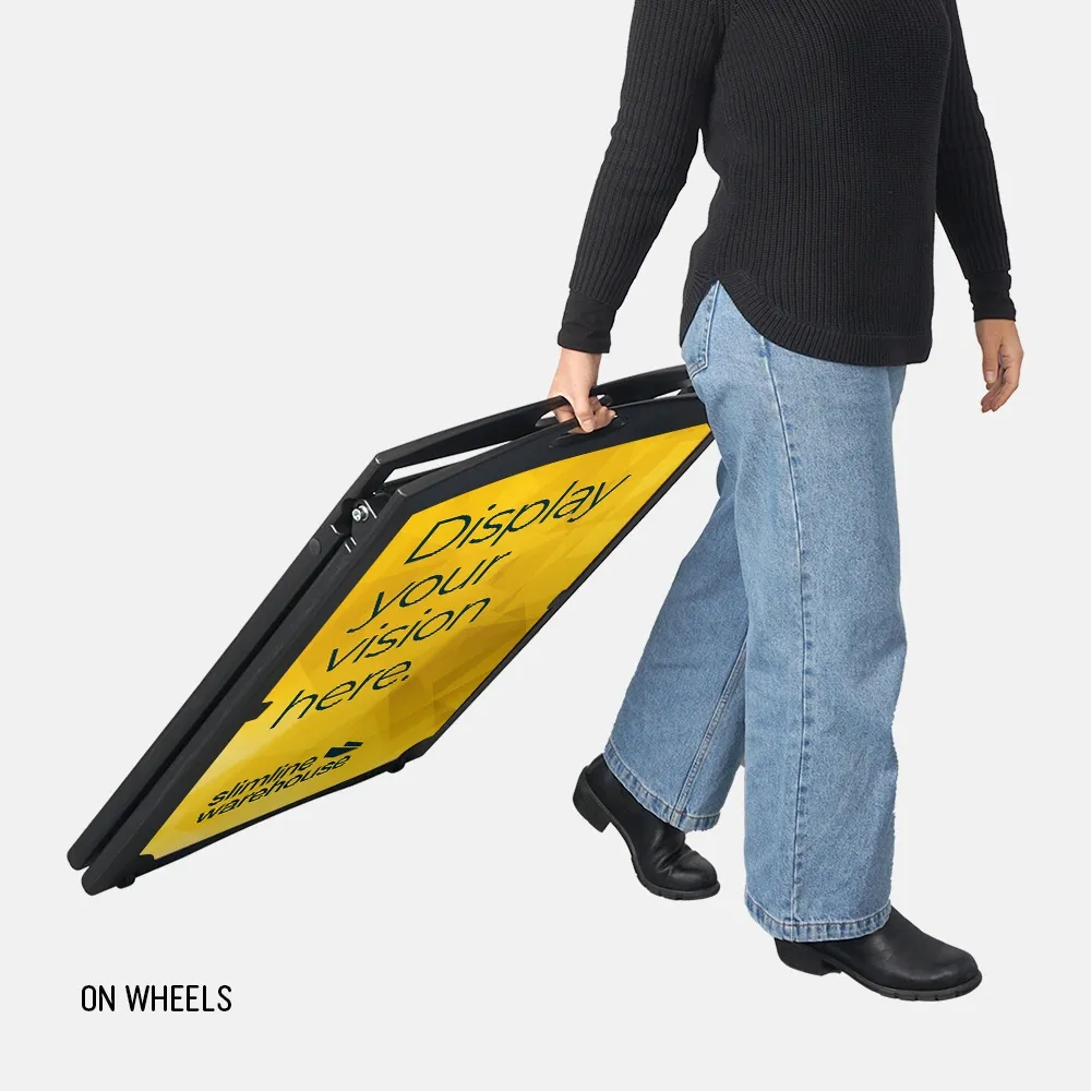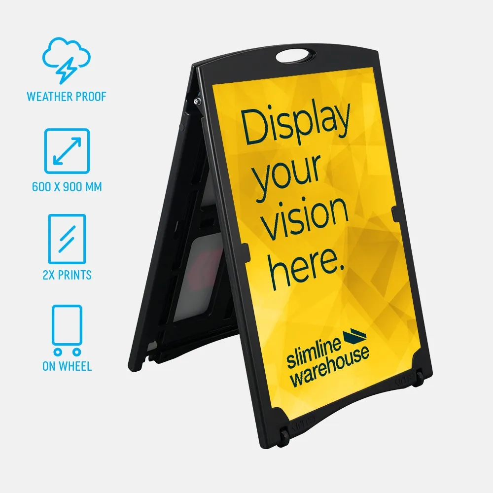 The printed A frame signs, like pavement displays, feature graphics on both sides to maximise space without impeding footpaths. The unit is designed for indoor use, but is rust-proof and has a UV coating to allow for outdoor use in good weather conditions. This portable display has a built-in handle to make carrying the 6.9kg unit easy. There is a wheel kit included as well to have (2) casters affixed to the bottom of one side to allow the display to be wheeled into place with ease.