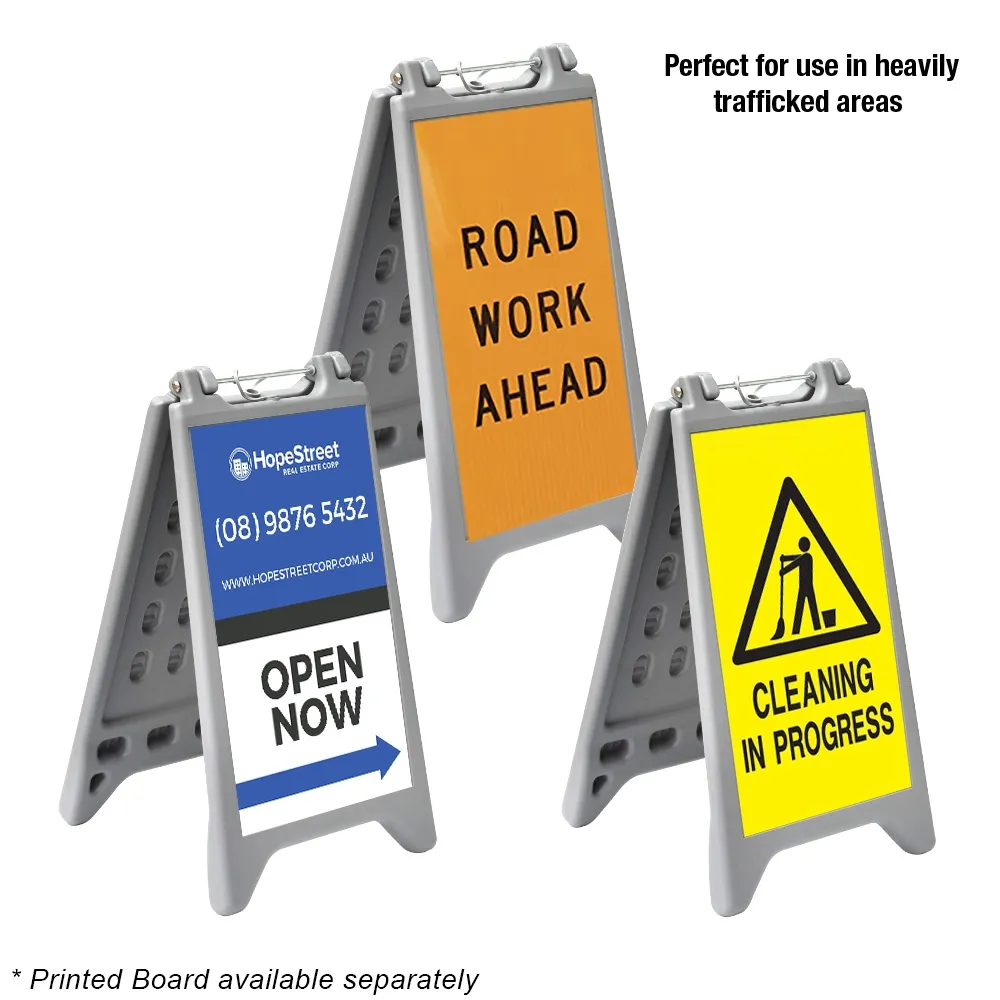 The cheap A frame is found in front of restaurants, bars, stores, and exhibition centres for advertising and promotional use. These outdoor signs are made from grey moulded roto plastic that is durable, making these units perfect for use in heavily trafficked areas. The pavement display, cheap A frame is collapsible, making it easy to move into different areas, or store when not in use. Outdoor signs are an inexpensive way to garner interest in your business that will lure in passersby.