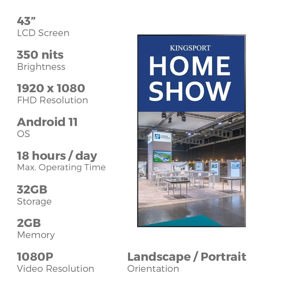 The 43” commercial monitor runs on Android® 11 OS, allowing users to access the Google Play store and easily manage a wide range of Apps and media. Android OS is capable for easy content updates via app, cloud, or USB. With 32GB of internal storage, the screen supports a variety of content such as videos, web pages, and promotional graphics.