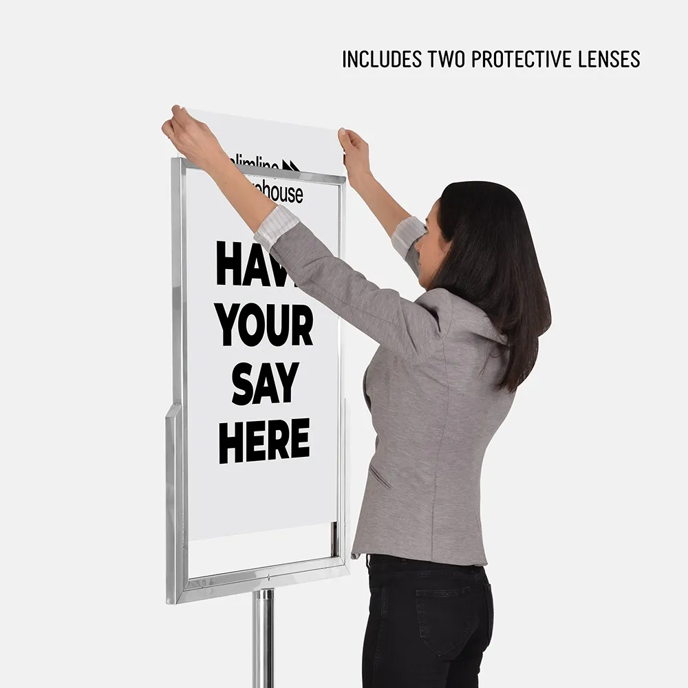 This freestanding sign holder is a dual-sided display stand that helps reach many visitors from a single vantage point. Each side is able to display an A1 (594 x 841mm) standard sized poster, with (2) 2mm thick clear acrylic protectors included as well. These protectors help to deter vandalism and keep posters from getting dirty during display. The metal poster displays is great for retail stores, shopping centres, museums, cinemas, exhibition halls, and more!