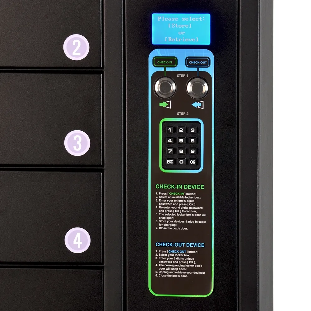 - Phone charging lockers features 8 units each with Lightning, USB-C & micro USB cables