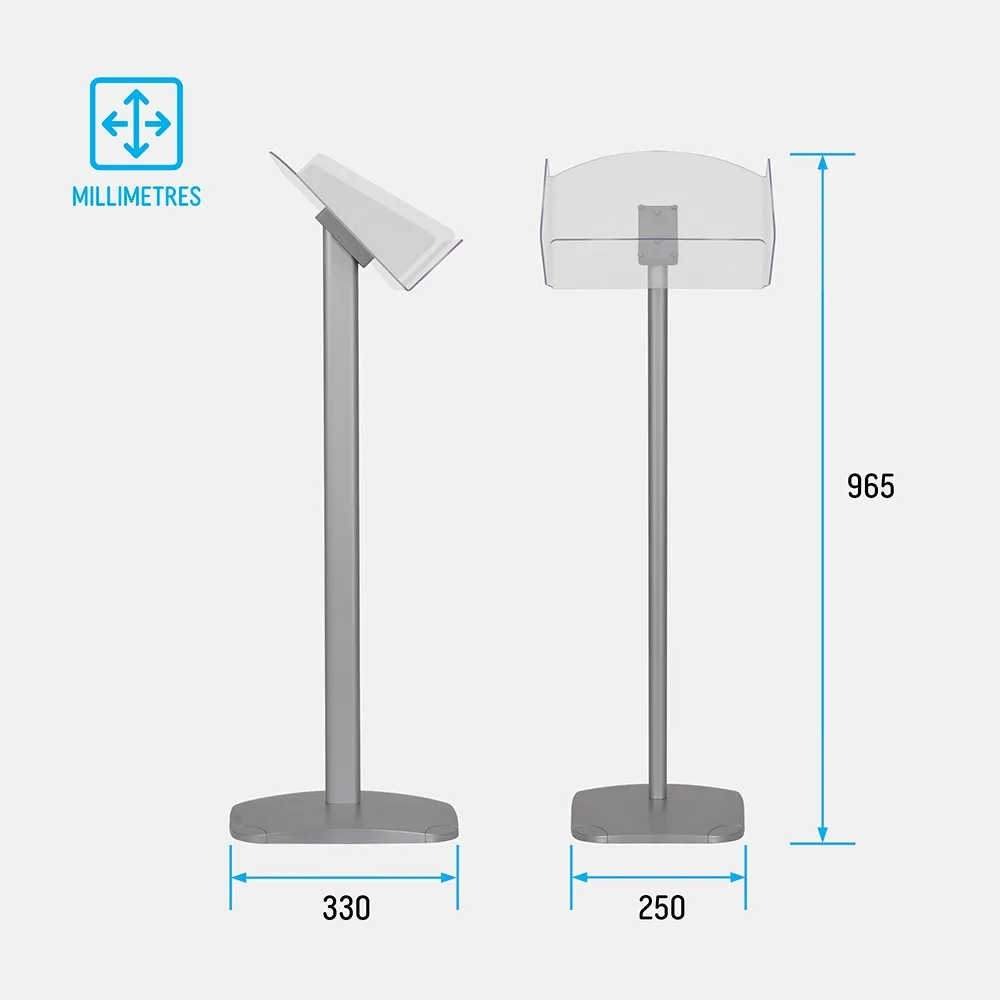 The A4 brochure stand, an effective literature display, features a large polycarbonate plastic pocket with raised sides. The _mm thick pocket is clear like acrylic, allowing full view of displayed materials. The large angled pocket tilts pamphlets towards visitors to help better garner their attention. The stand has a total height of 965mm, with a footprint of 250 x 330mm to take up little space in all locations.