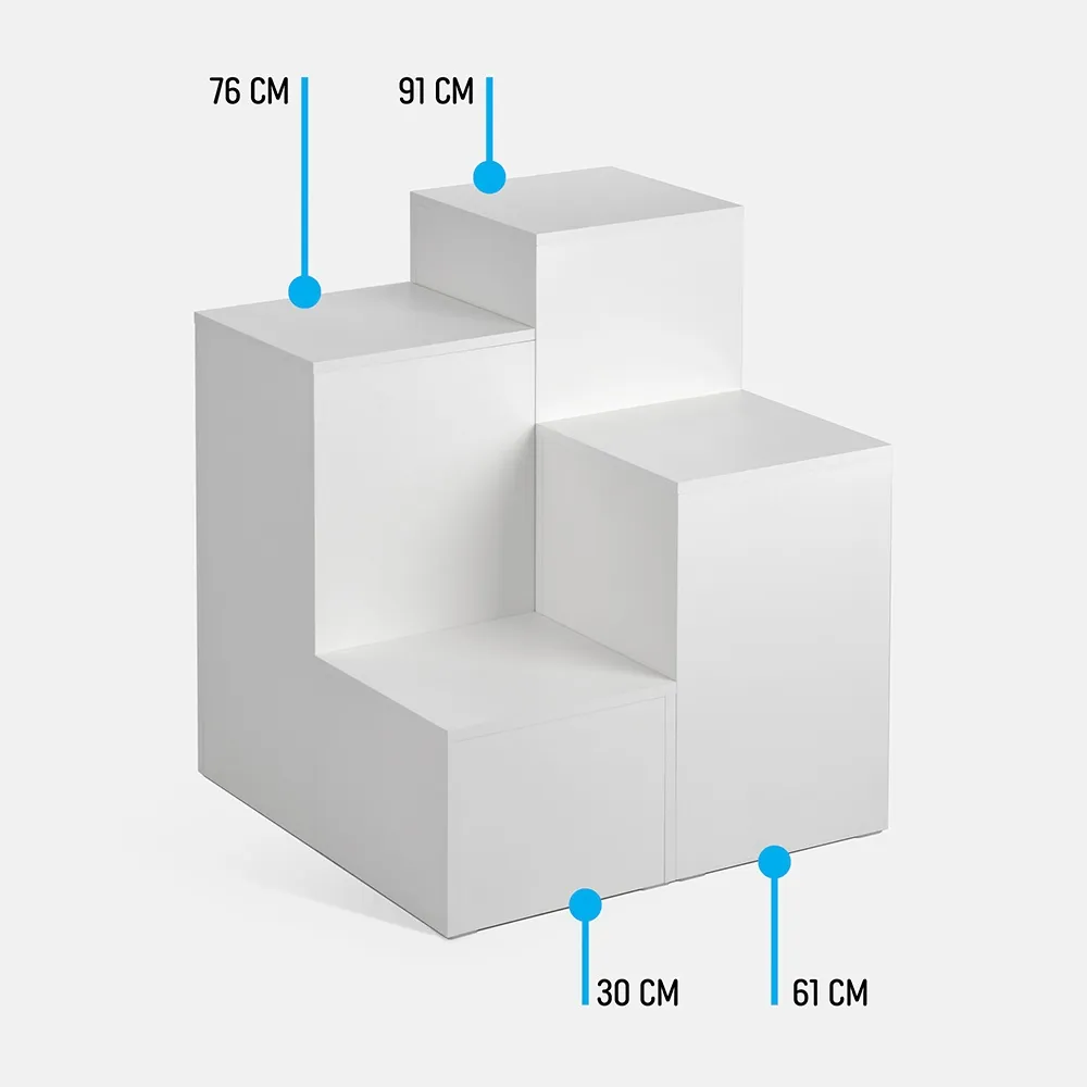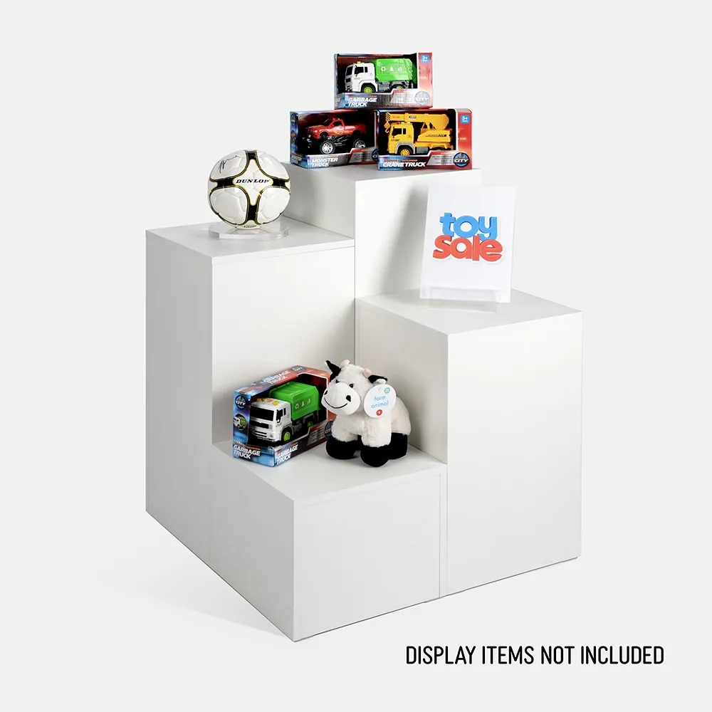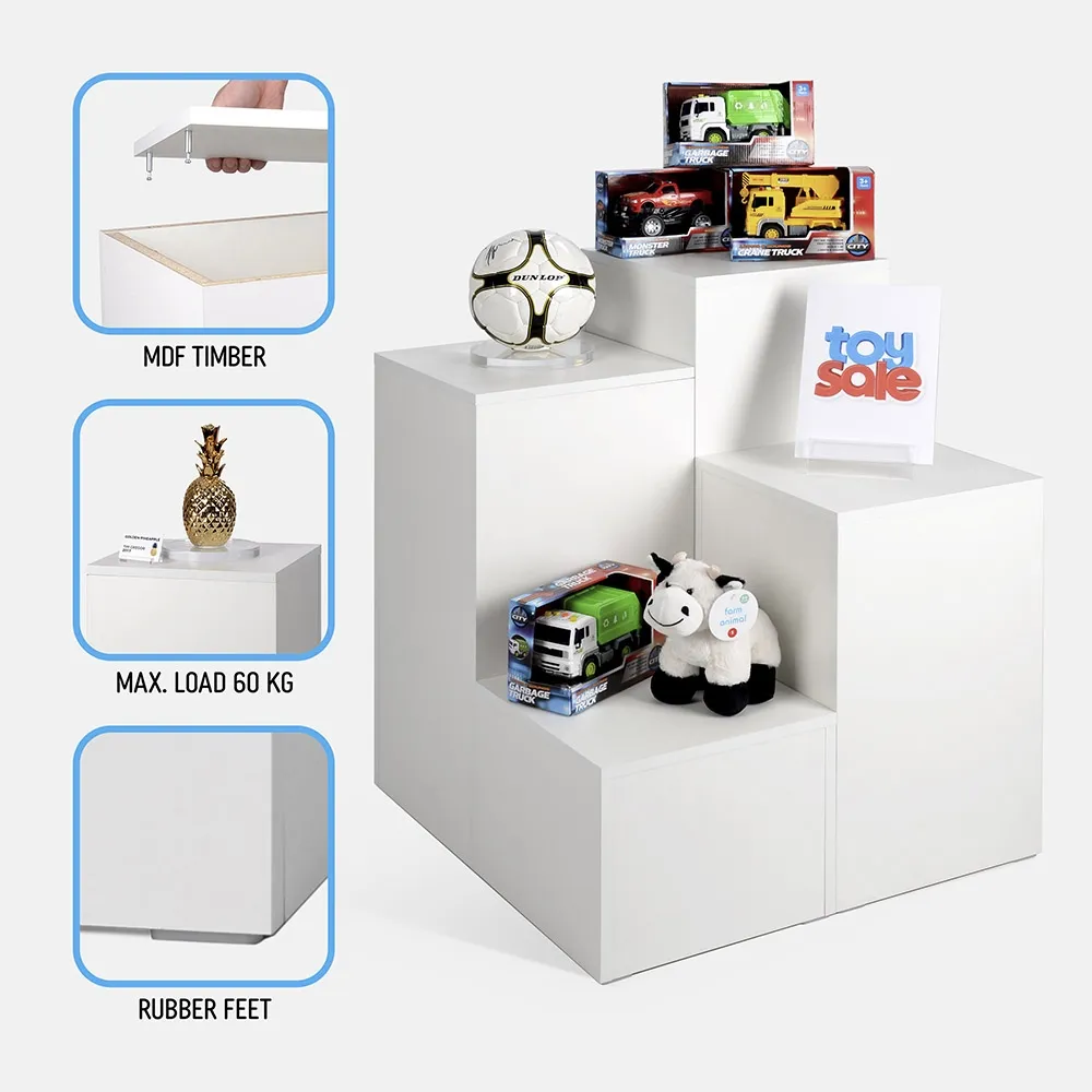 The retail fixtures, white display plinths include (4) different size heights to make different configurations possible to best fit the needs of your location. The 30, 61, 76 & 91cm tall displays are great for showcasing different items and attracting passersby. Each stand has a 38 x 38cm top area that can hold many sizes of items without issue. The various heights are great for holding museum or art gallery pieces or displaying an out of the box product in retail stores and shopping centres to provide customers with a full view.
