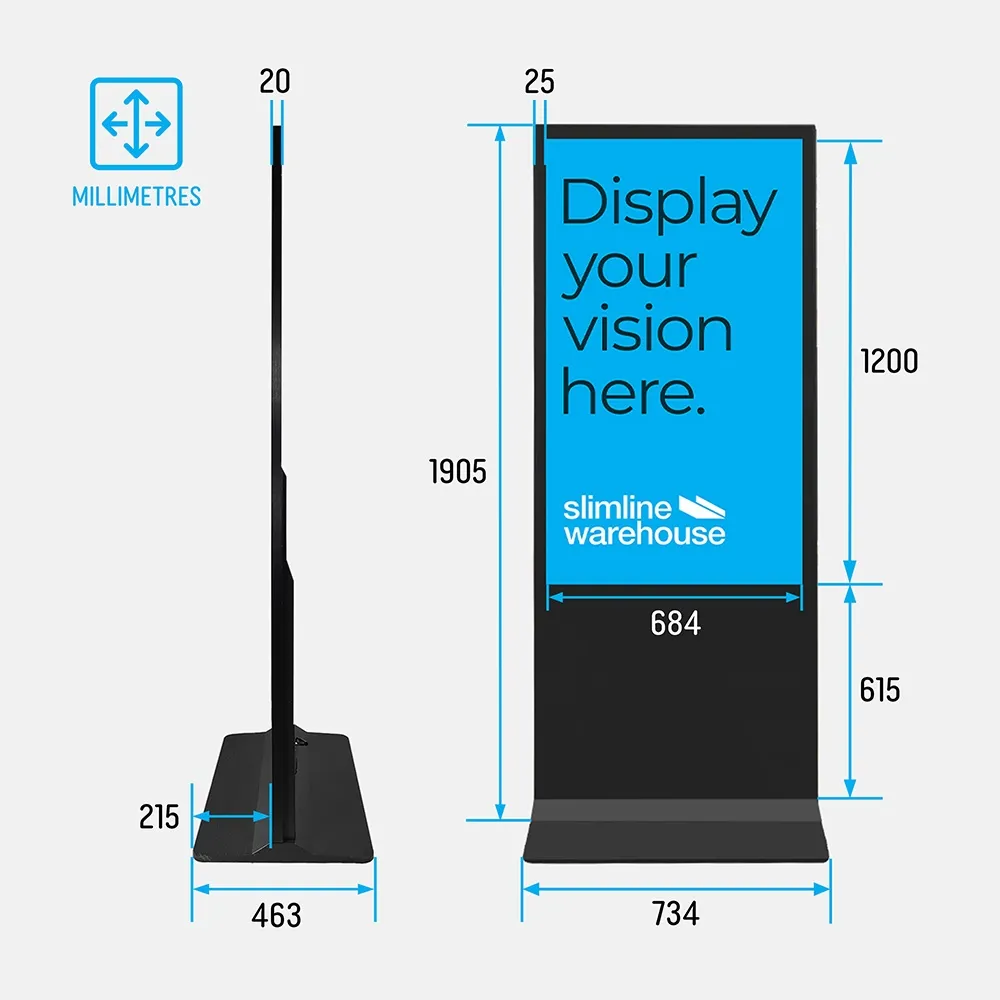 Designed for long-term operation, the 55 inch Dline digital signage totem combines digital content with permanent printed branding to deliver a polished, high-visibility communication solution.