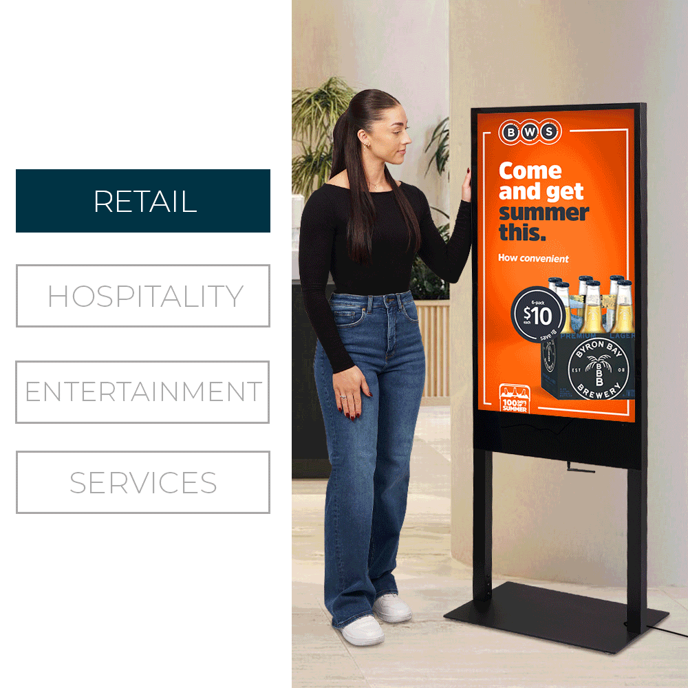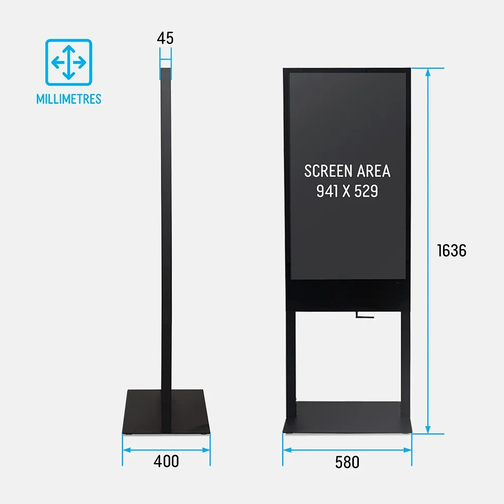 This floor standing LCD poster is made from steel and aluminium with a matte black finish for a professional appearance. Two built-in 8W speakers can play audio alongside your content, while an output on the rear panel supports connection to external audio systems for more options. The included remote control makes navigation of the unit easy for set-up and on site content management. These totems arrive mostly pre-assembled with only the base requiring attachment to be ready to go nearly out of the box. Same-day Australia-wide dispatch is available for orders placed by 3pm AEST, buy online today from Slimline Warehouse!