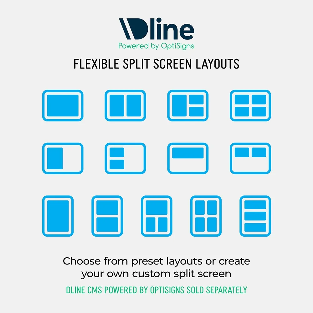 - Create a video wall with up to 4 separate screens for wider content range