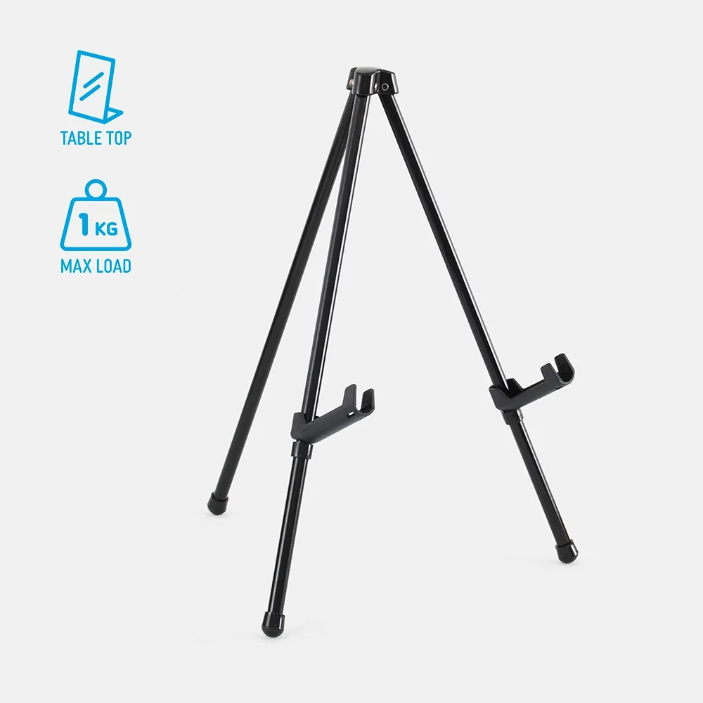 Countertop easels are made from tubular metal with a black finish, offering a sleek display that blends in well with any surrounding. Each leg is independently movable for changing the height and angle items are displayed at. These legs also feature a rubber cap that helps with traction as well as preventing scratches on tables or desks.