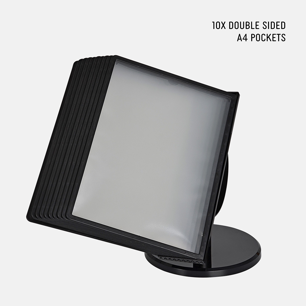 - 10 x A4 document pockets present 20 pages of info fixed into the display stand