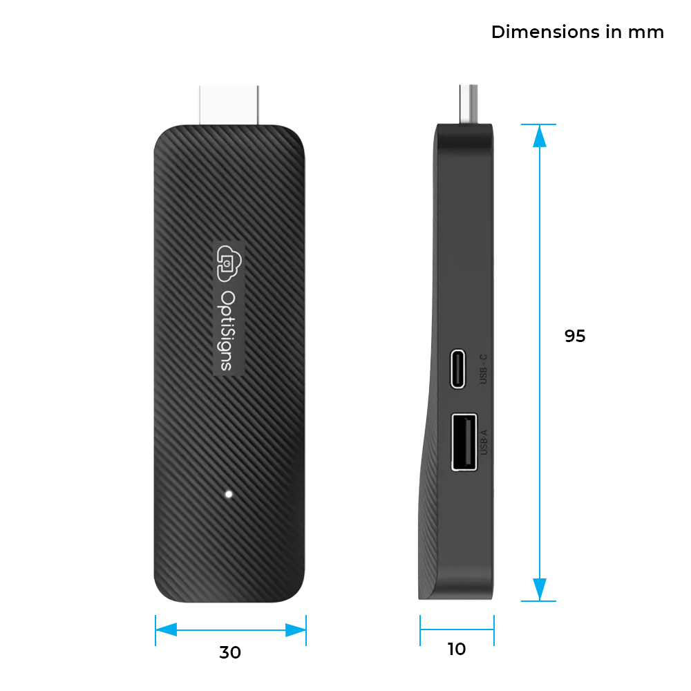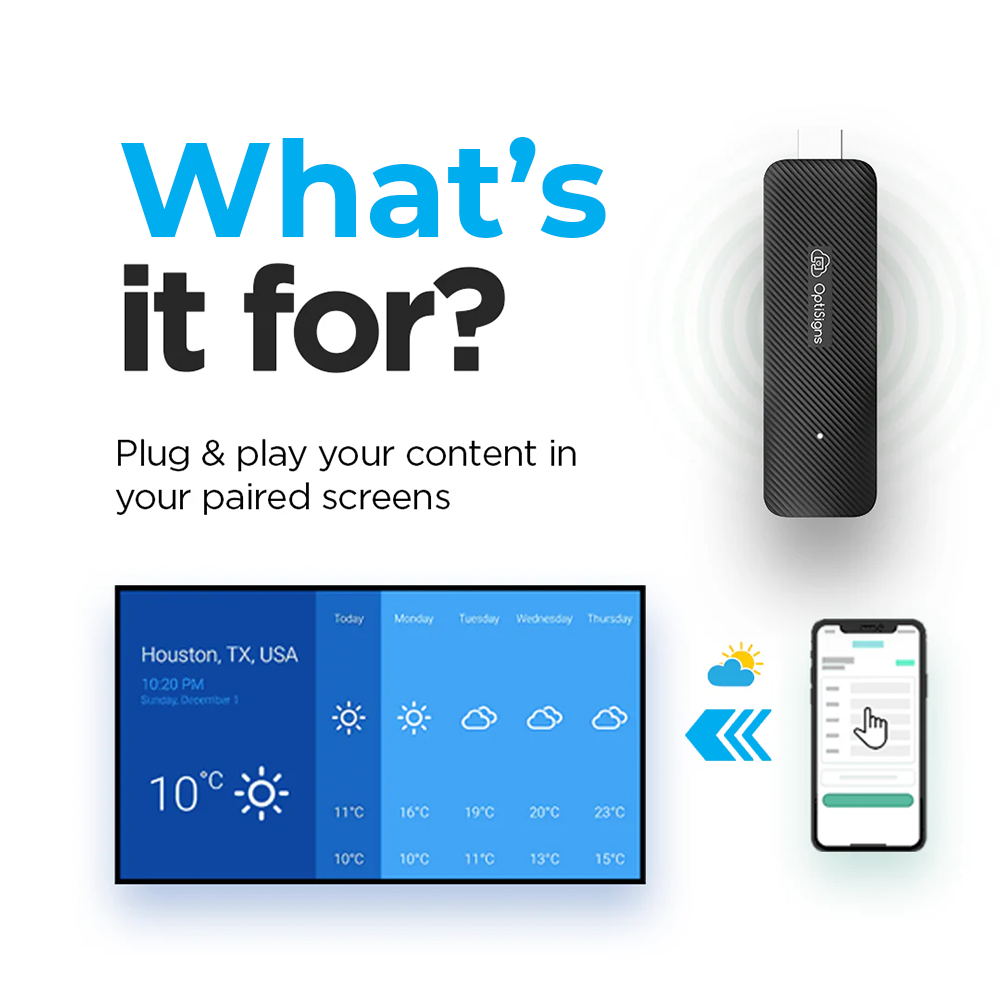 Expertly designed, our OptiStick digital signage player delivers stunning 4K content, supports multiple split-screen zones, and is fully compatible with all OptiSigns software features and apps.