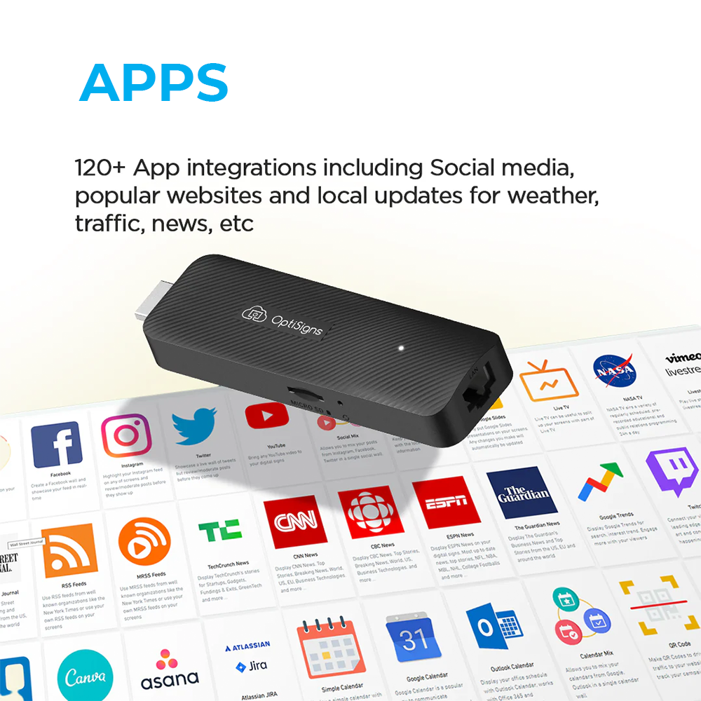 - Optimized for Digital Signage, Suitable for digital signage use, fully support all OptiSigns features, apps.