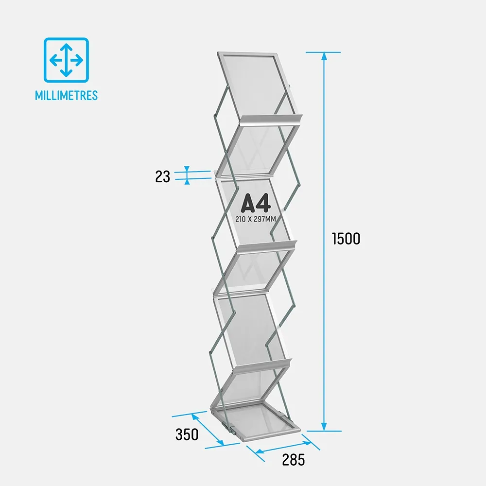 The brochure pockets are 215 mm wide and 300mm long to perfectly accommodate one A4 brochure or 2 x DL brochures sided by side.
