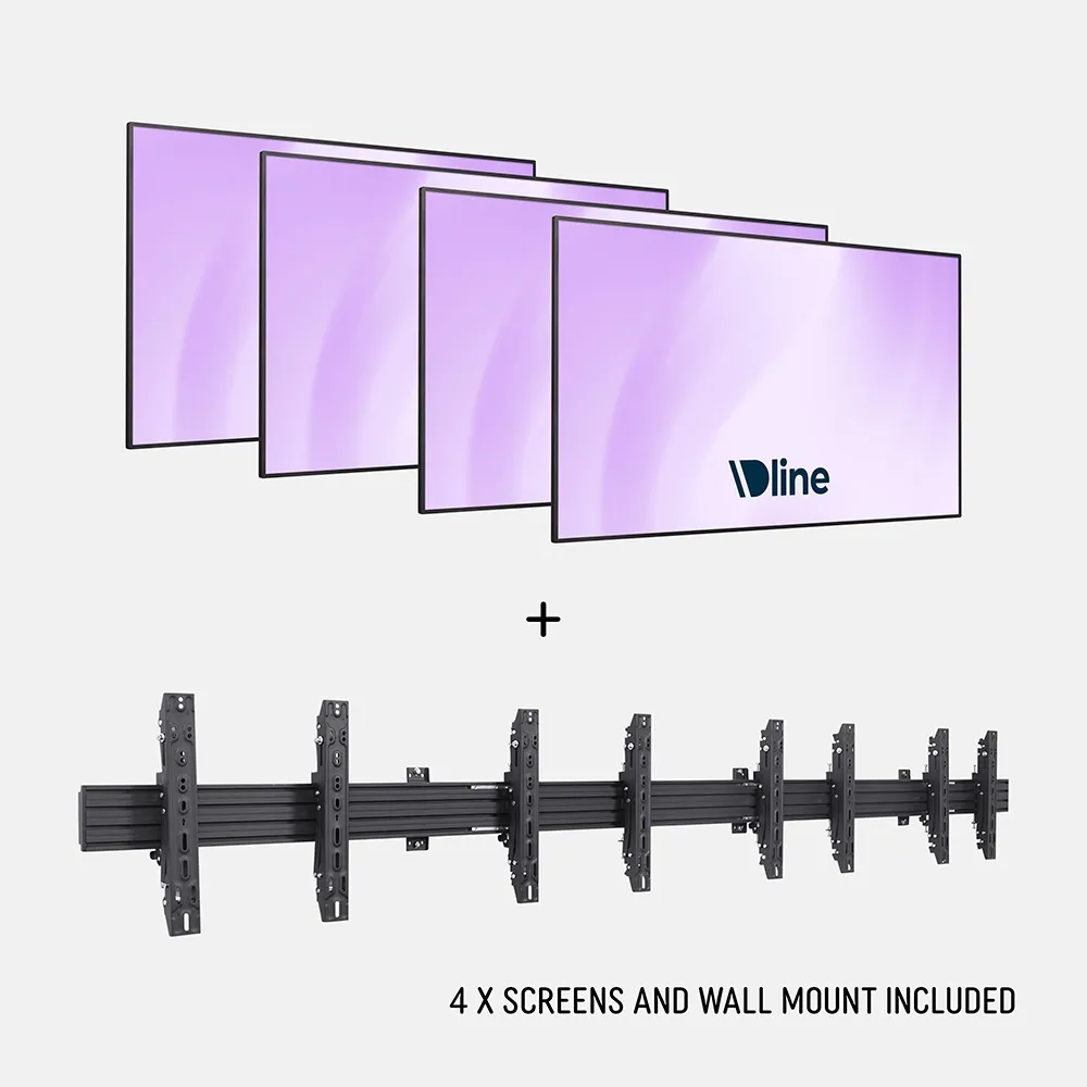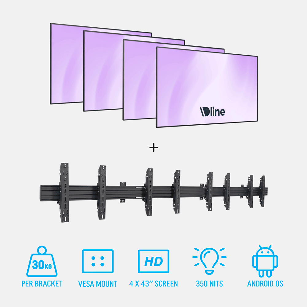 The 4 TV video wall mount, like a professional menu or screen display bracket system, includes four 43" flat panel screens. This all-in-one digital signage package runs on Android® 11 OS and offers the full array of Google Play store Apps to easily create presentations at any location. A wide range of media can be shown, including videos, web pages, and images, with uploading of files able to be done remotely or on site to accommodate different needs. The flat panel digital signage screens are commercially rated, good for use up to 18 hours per day to be used in entertainment venues, play centres, souvenir stores, restaurants, museums, libraries, and more. A 2-year warranty is included with the screens that covers regular use to provide you with peace of mind with this purchase.
