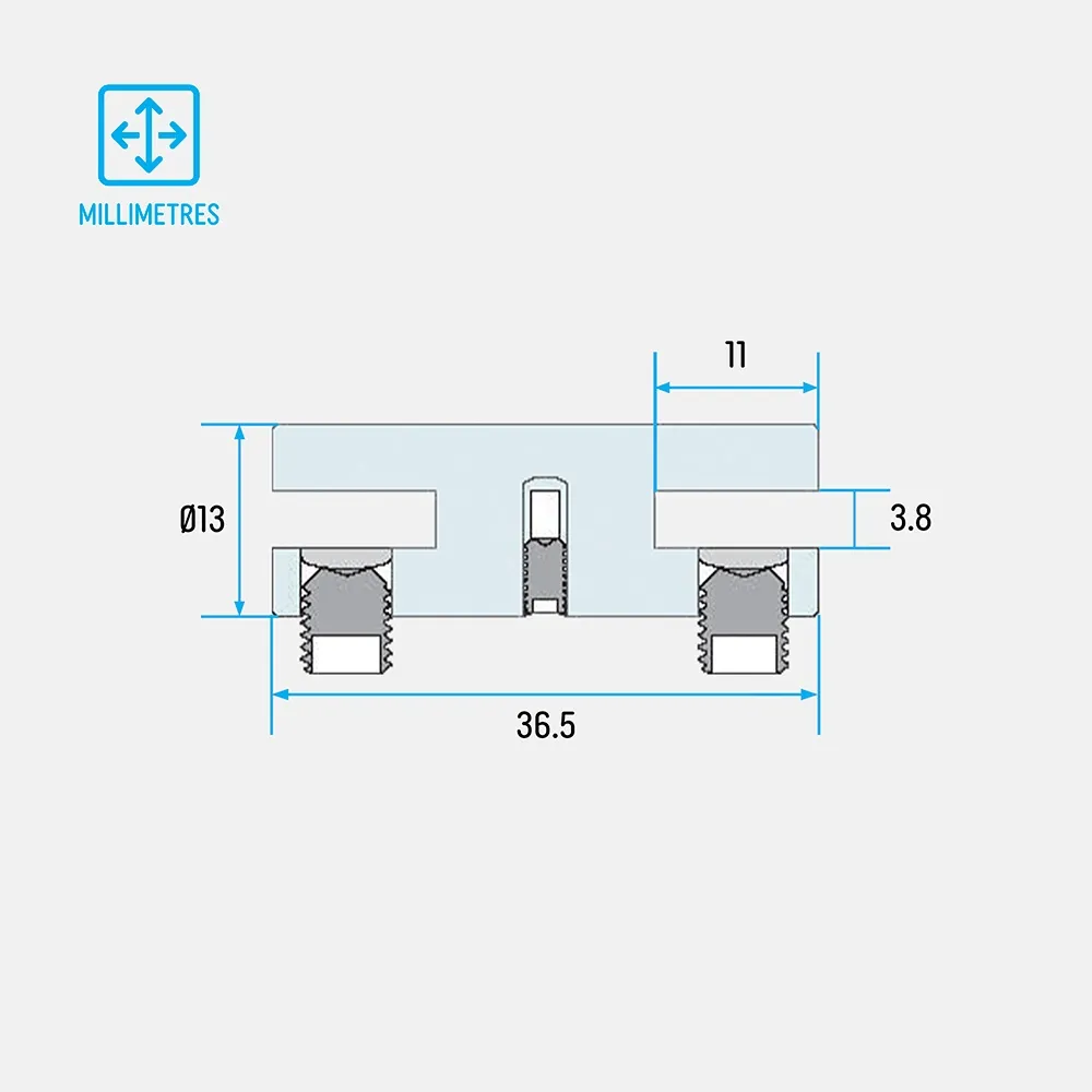 The cable mount, also known as cable fittings and cable panel clamps, must be used in tandem with cable displays, which are available here. The cable panel clamps can hold signs up to 3.4mm mm in thickness. This cable mount is used in the middle of a display to hold the sides of two signs. The opposite side of your chosen signage will need a singular standoff in order to hold it in place. Allen screws tightly grip the sides of your signs. The tips of these screws are plastic-tipped in order to not scratch signage materials. The middle of the cable mount holds another allen screw that is used to secure the panel clamps around a cable.