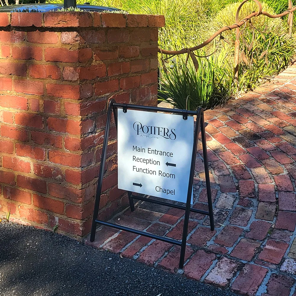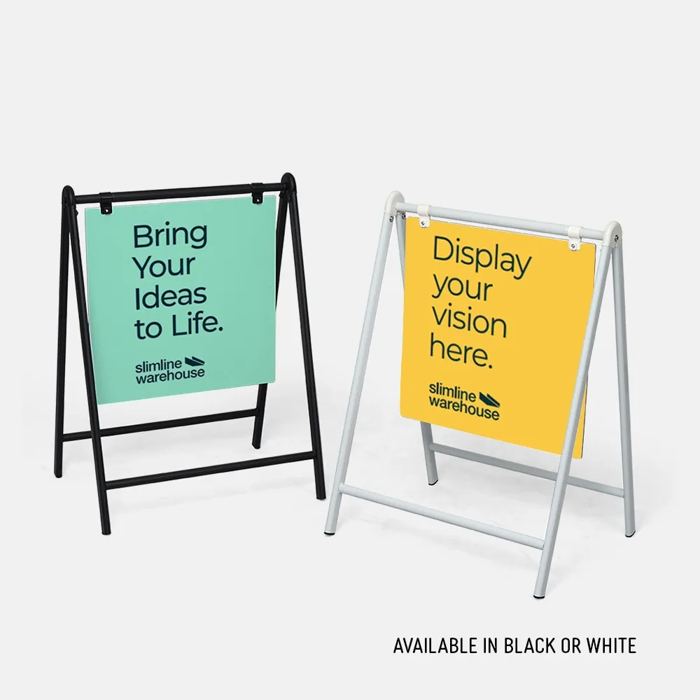 - Swing sign features dual-sided 450 x 450mm board with custom printed graphics!