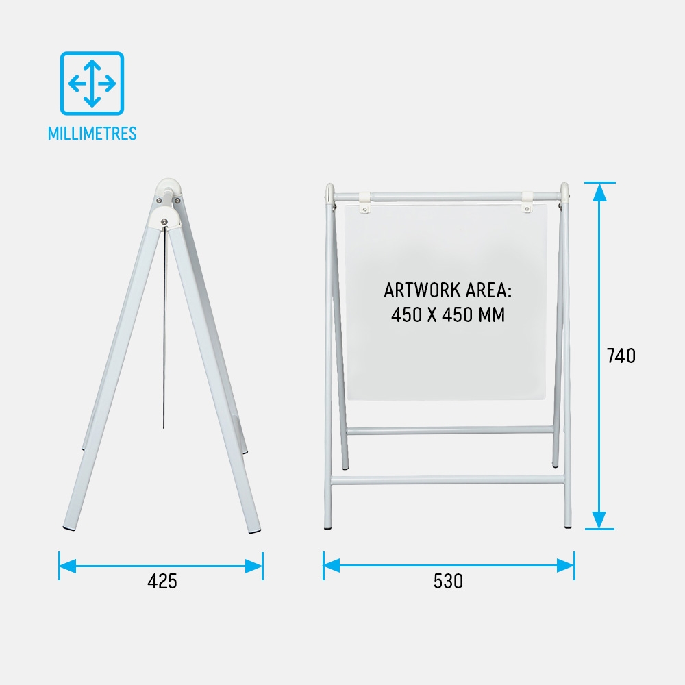 This swing sign frame combines a lightweight design and unique look to help any business effectively market to passersby! The hanging aluminium panel is 450 x 450mm, offering plenty of space for graphic designs on each side. The 2-sided display helps to reach more people at once from a single footprint whilst only taking up a small space. When open, the unit is 725 x 740 x 530mm, the perfect size for placement outside of a business without impeding footpaths. This swinging signage display collapses to 530 x 750 x 60mm to be easily carried into place or stored in a small space in between uses!