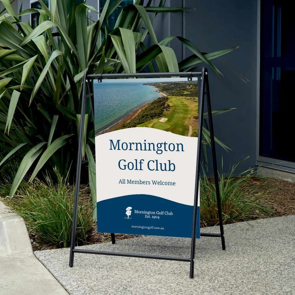 This pavement swinging sign is designed for both indoor and outdoor use, making a great addition to any marketing plan. This display has custom printed graphics on both sides of the hanging sideboard, with the large A1 display allowing for large text and vivid imagery that will surely draw in passersby. A digital printing process is used to ensure true depiction of design with vivid colours that turns heads. This display can be found outside of retail stores, cafes, information centres, exhibition halls, shopping centres, restaurants, transportation hubs, and more.