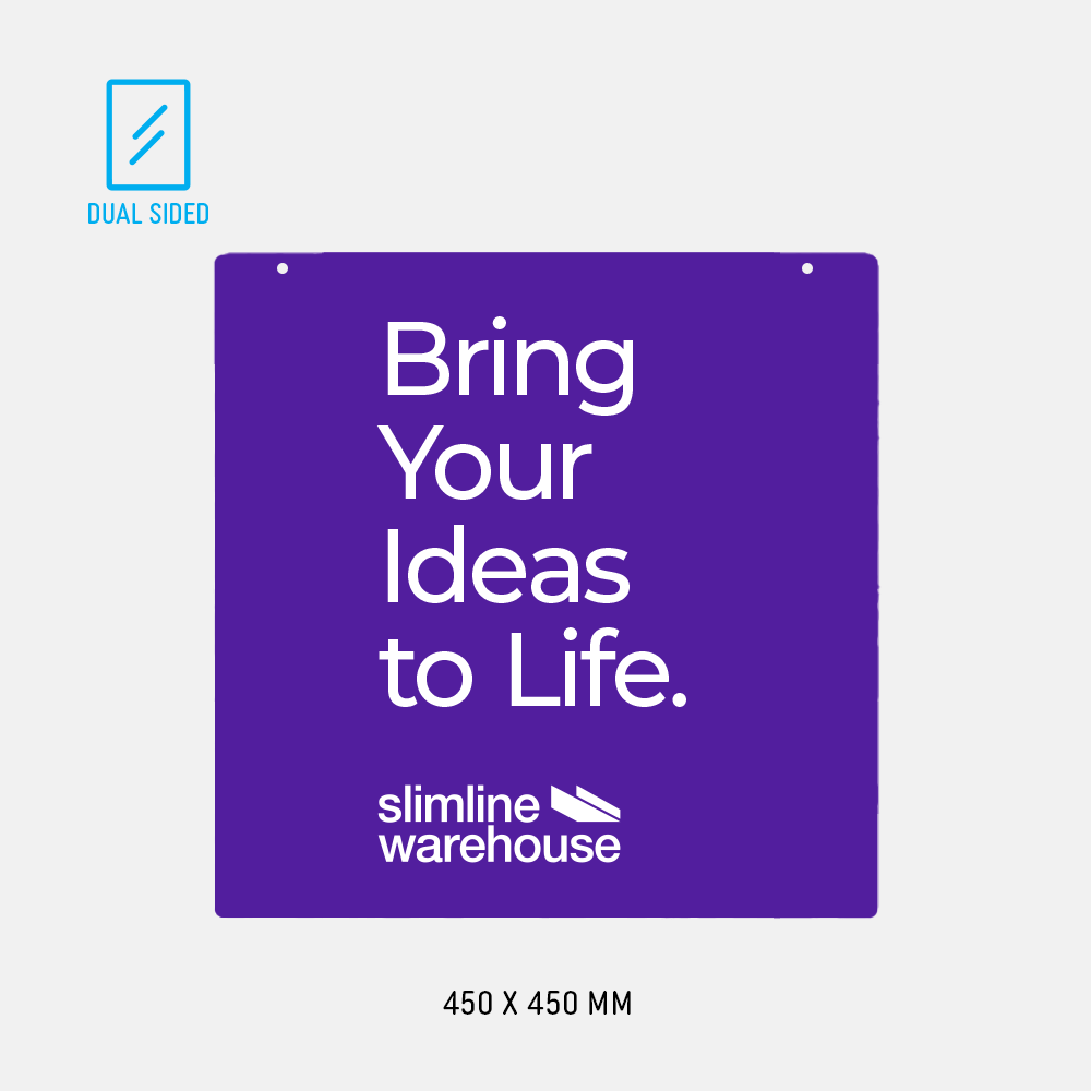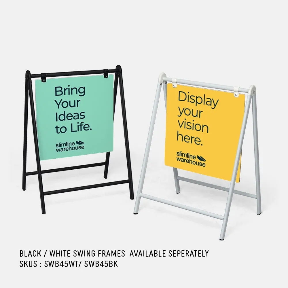 The custom print swing sign is made out of 3.5mm thick aluminium, offering a cost-effective and durable display. There are cut-outs at the top to easil yinstall this unit onto your existing swing sign. Our in-house design team is available for help, offering three tiers of assistance based on your needs. Order online today for quick shipping from Slimline Warehouse to anywhere in Australia!