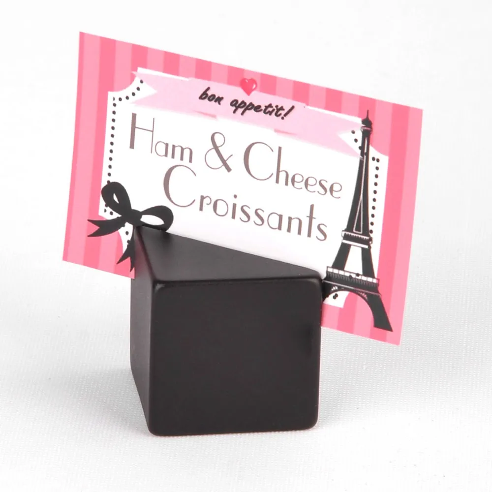 These table card holders, also known as a wedding number stand and acrylic sign display, are an inexpensive display with a sleek look for use in any location. The small cube is a black acrylic block that takes up little space on a table or countertop to leave plenty of room for merchandise or decorations. This durable display is great to buy in bulk to have a standard sign holder at different tables or coutners at your location.
