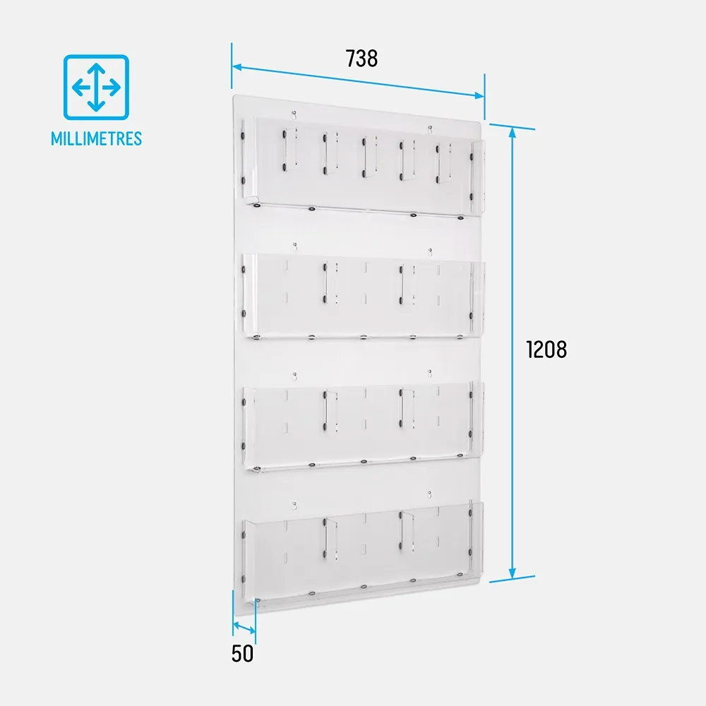 This brochure or magazine wall rack has 12 clear acrylic pockets. Each pocket can hold a single A4 (297 x 210mm) brochure or, simply by adding one of the acrylic dividers included with the unit, can be converted to hold 2 x DL flyers side by side. This results in a total capacity of either 12 x A4 or 24 x DL brochures, or any combination between the two.