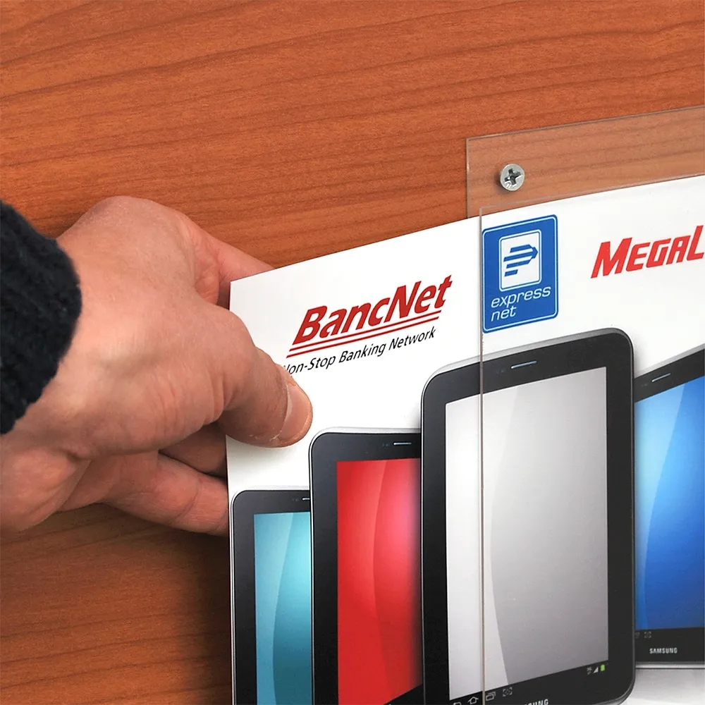 This simple display is designed to hold a single A3 sheet in landscape format (297 x 420mm). Its fabricated in clear acrylic and is designed to be fastened directly to a wall or other shop fixture on your premises. Alternatively you can hang this sign holder from the ceiling of your premises.