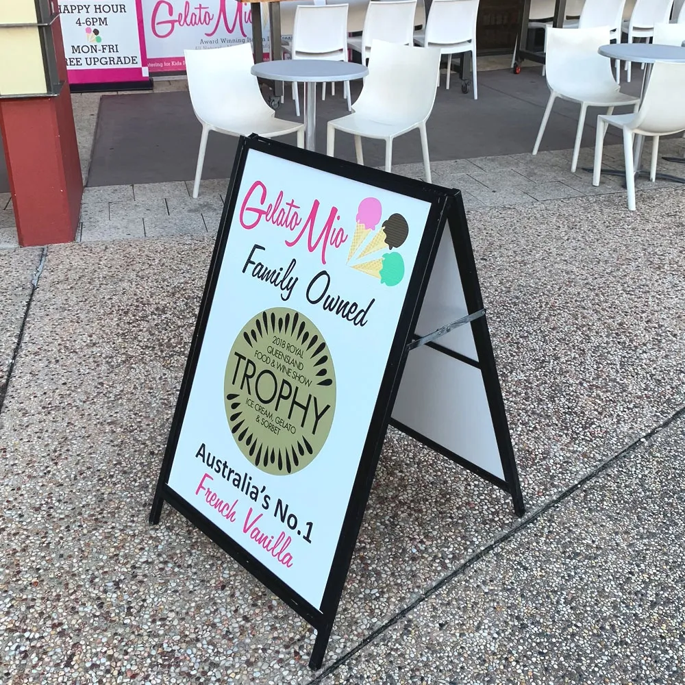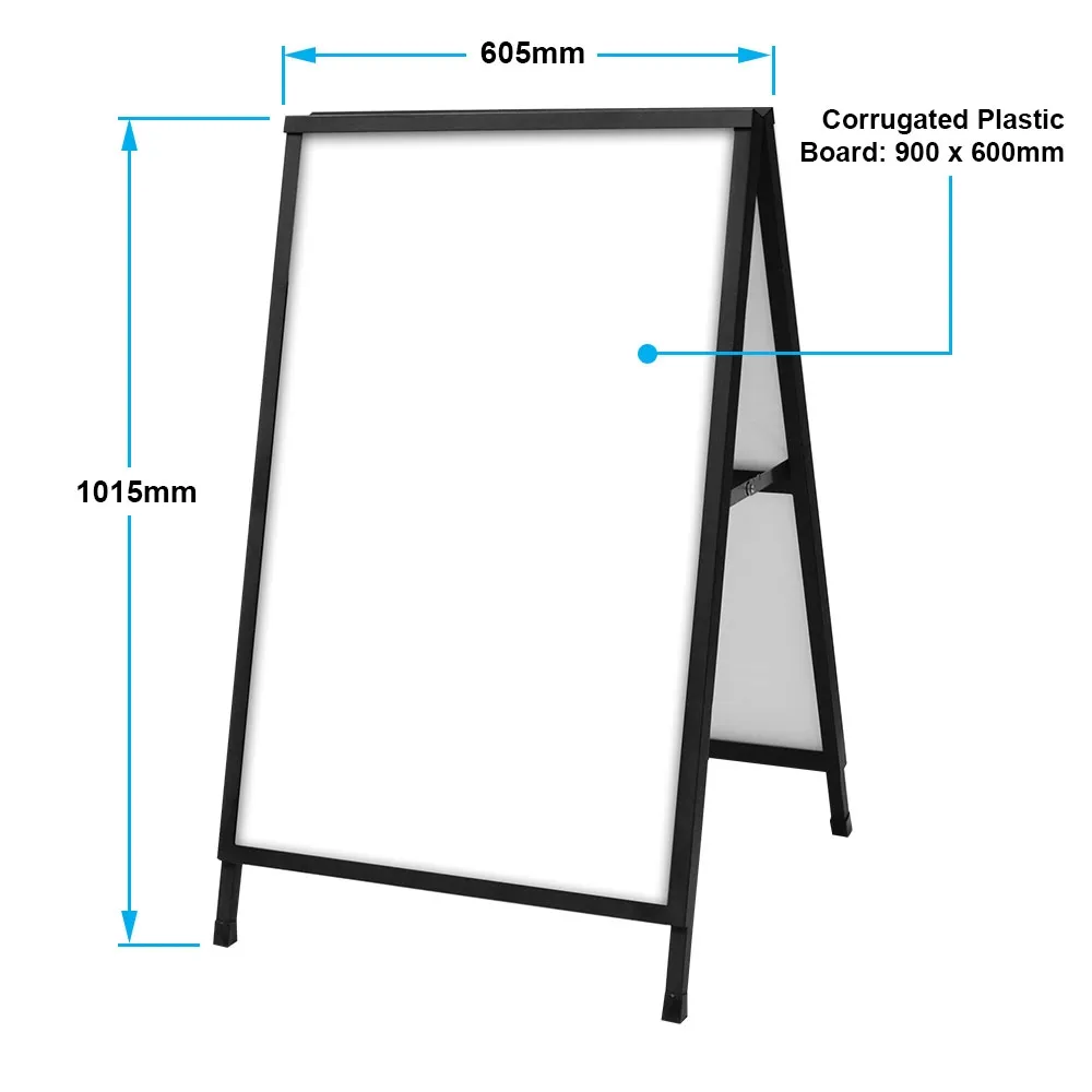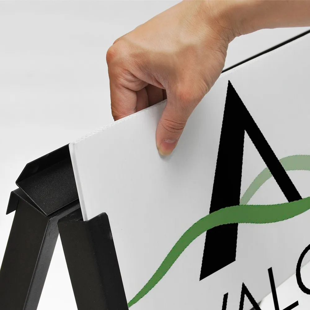 This slide-in A frame sign provides an affordable and effective way to attract more customers and increase visibility for businesses. This display includes two 5mm thick corrugated plastic panels, each measuring 600 x 900mm, with custom digitally printed graphics. The black powder-coated steel frame ensures long-lasting durability for both indoor and outdoor use, offering resistance to rust and wear in public spaces. The slide-in design allows for effortless poster changes, making it easy to update promotions, seasonal advertisements, or directional signage in seconds.