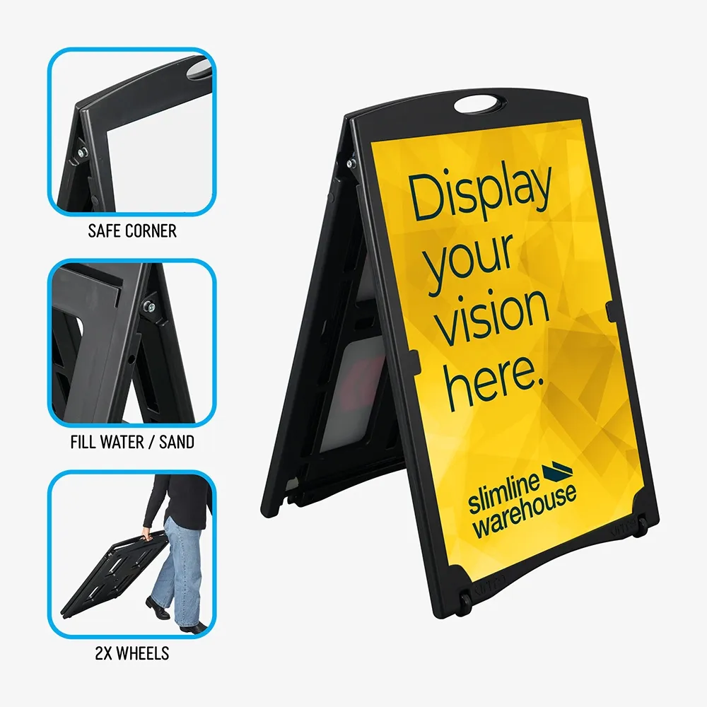 The printed A frame signs, like pavement displays, feature graphics on both sides to maximise space without impeding footpaths. The unit is designed for indoor use, but is rust-proof and has a UV coating to allow for outdoor use in good weather conditions. This portable display has a built-in handle to make carrying the 6.9kg unit easy. There is a wheel kit included as well to have (2) casters affixed to the bottom of one side to allow the display to be wheeled into place with ease.