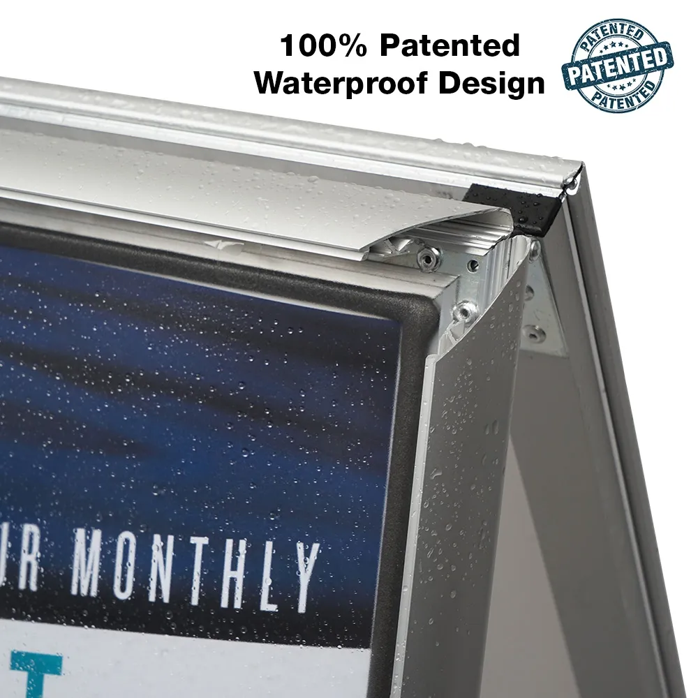 - Patented waterproof design uses rubber gaskets to prevent liquid seepage onto posters