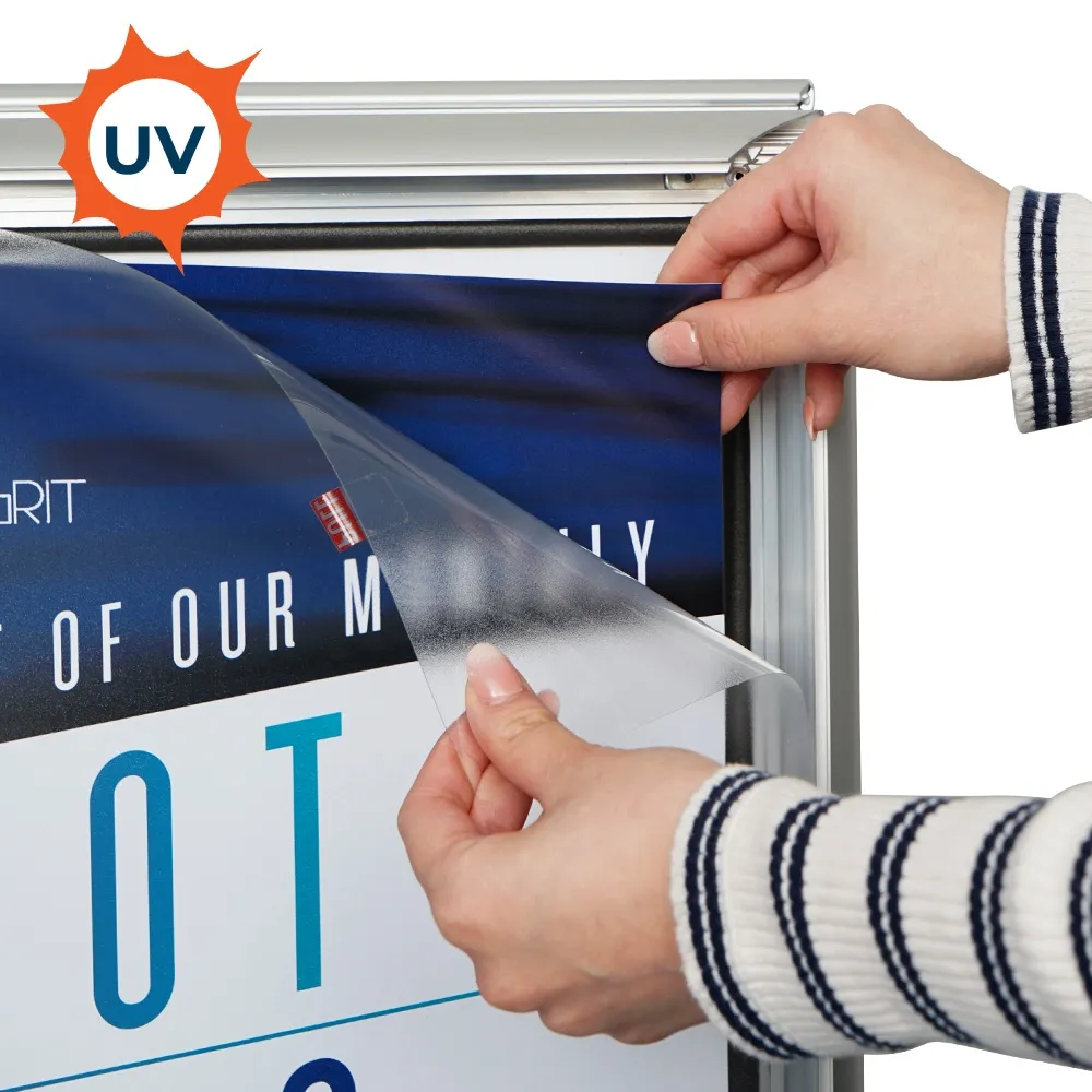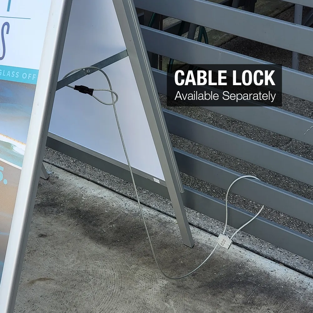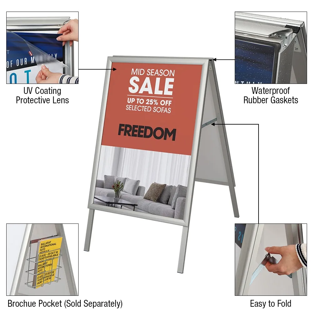 A frame advertising boards make it simple to promote outside of restaurants, retail stores, shopping centres, museums, information centres, transportation hubs, and more! The 2-sided design offers visibility in multiple directions from the 660 x 1100 x 830mm display whilst taking up little space on the pavement. Each side of the display has a snap frame that makes it easy to switch out graphics without tools necessary. Simply open the (4) sides and remove the lens along with the existing poster, place the new poster inside with the lens on top and snap shut for full changes in under one minute!