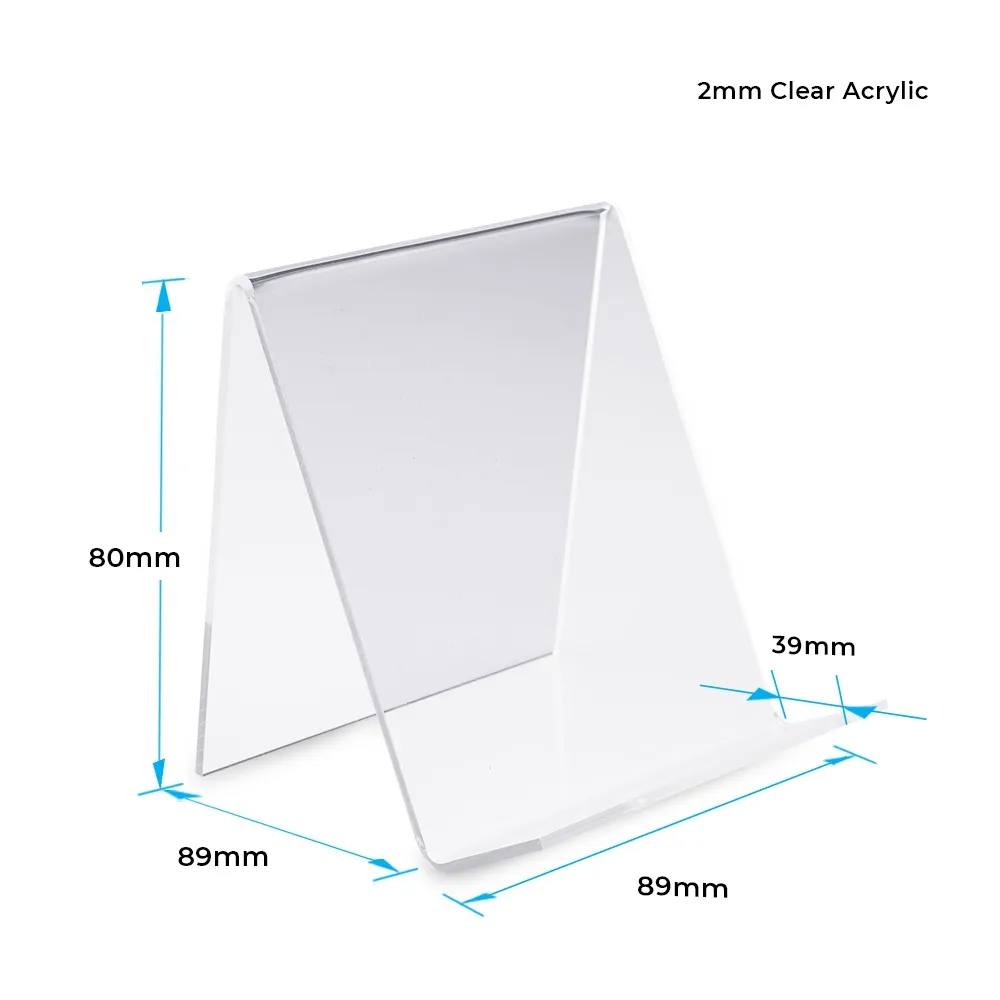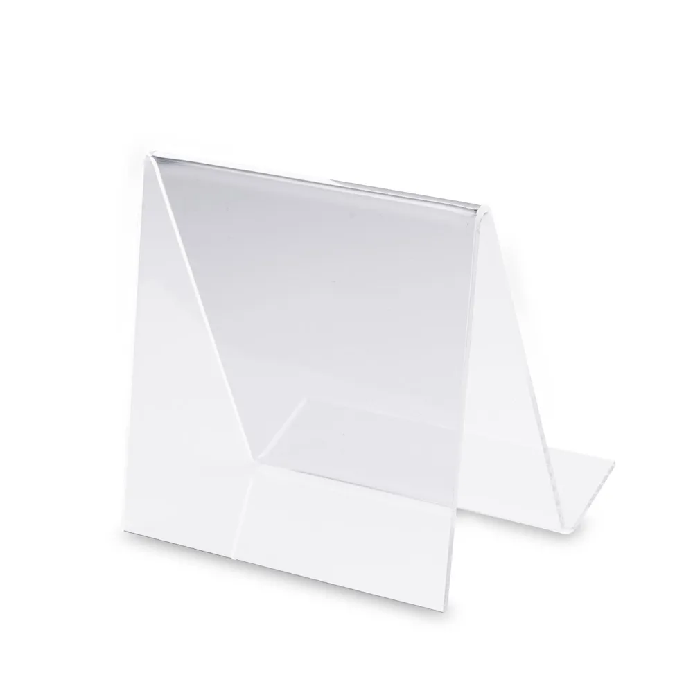 The acrylic display stand, like a mini acrylic easel, is made out of 2.5mm thick clear acrylic with polished edges for a high-end finish. The durable plastic construction has the look of glass but is shatter-resistant, making it a safer and longer-lasting option. A raised front lip keeps displayed items from slipping, while the rounded corners add safety when handling or repositioning the stand. This freestanding holder comes fully assembled in once piece, making it simple to move and reuse as needed.