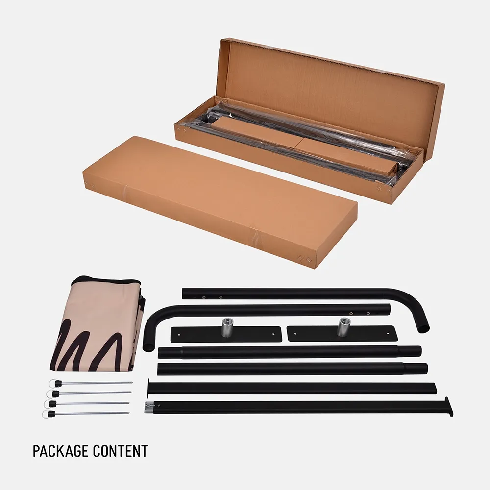 The canvas barrier, like outdoor wind barriers, utilise black aluminium frame designed for both indoor and outdoor use. Assembly requires no tools, as the clearly labeled snap together poles are simple to set-up quickly. There are ground stakes included for securing the cafe banners to grass or soft ground when used outdoors. For pavement use, there are weight bags available for separate purchase.
