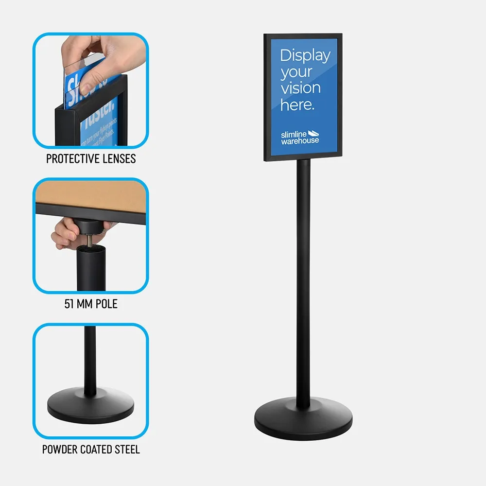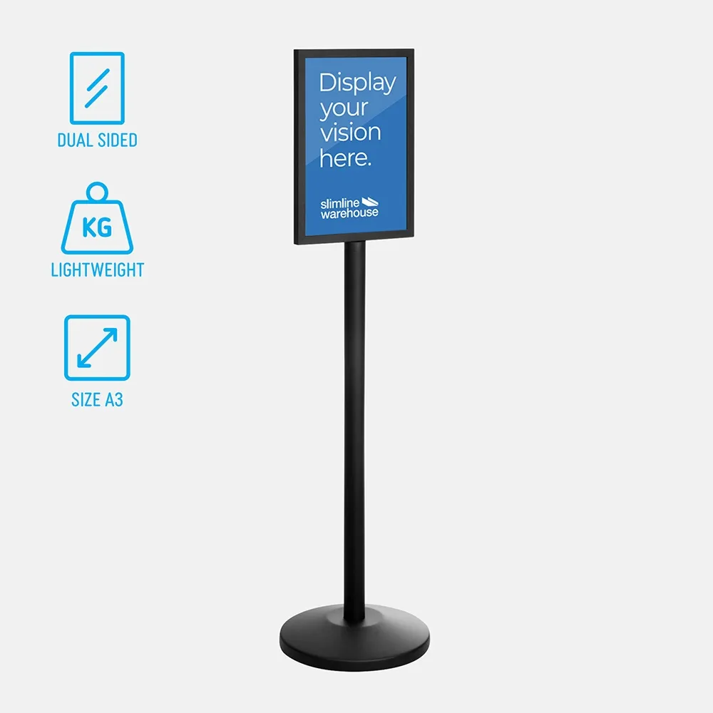 At 1420mm tall, this display is easily seen by passersby without being an eyesore. The stand is made from powdercoated steel to offer durability, and has a black finish for a sleek look that fits in with many different decors. The stand weighs 10kg, making it easy to move the lightweight frame into your desired position. The base is weighted as well to help with stability and prevent it from easily tipping over. Order today by 3pm AEST to receive same day despatch from Slimline Warehouse with most in stock products!