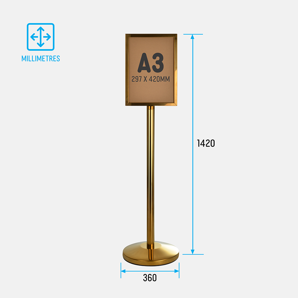 - A3 (297 x 420mm) posters in portrait format fit within each side of dual-sided stand