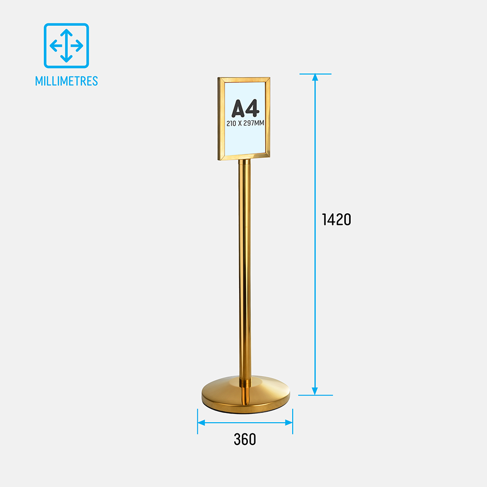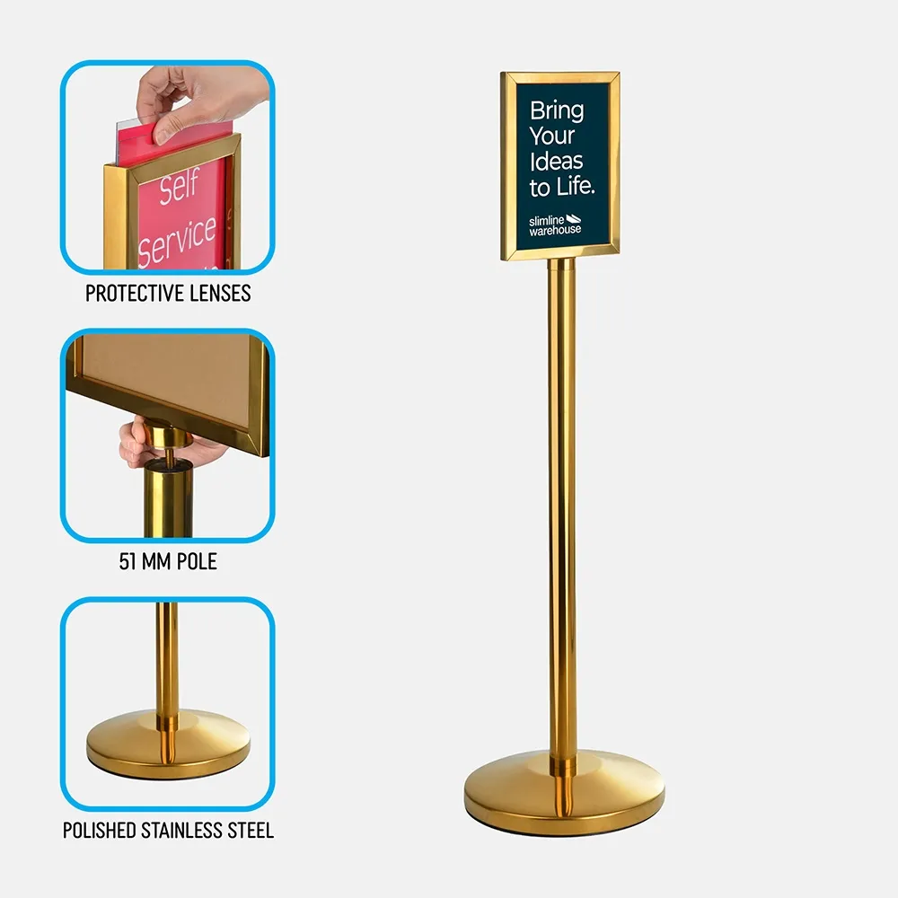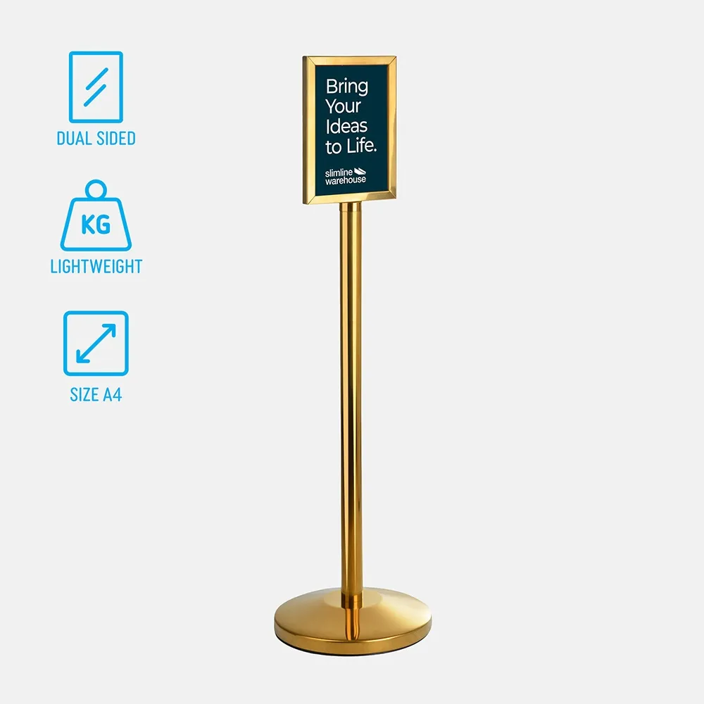 This stand alone sign holder displays A4 (210 x 297mm) posters in portrait orientation. The stainless steel poster stand has an upscale gold finish, perfect for use in casinos, hotels, restaurants, retail stores, and more. This display looks great with different decors and the steel ensures long-lasting use. The dual-sided display can be seen in multiple directions, helping to maximise floor space as only one display is required to be seen by many passersby.