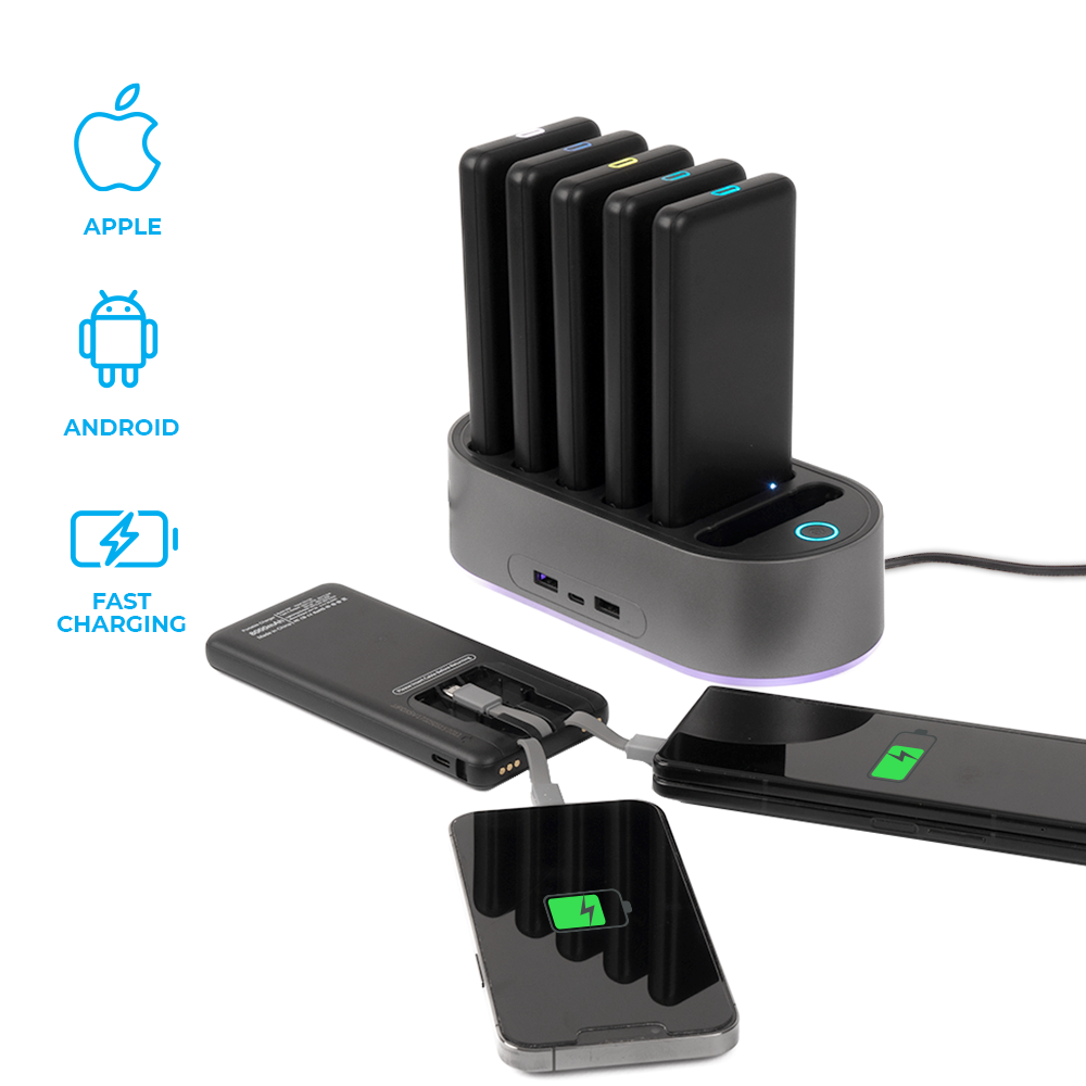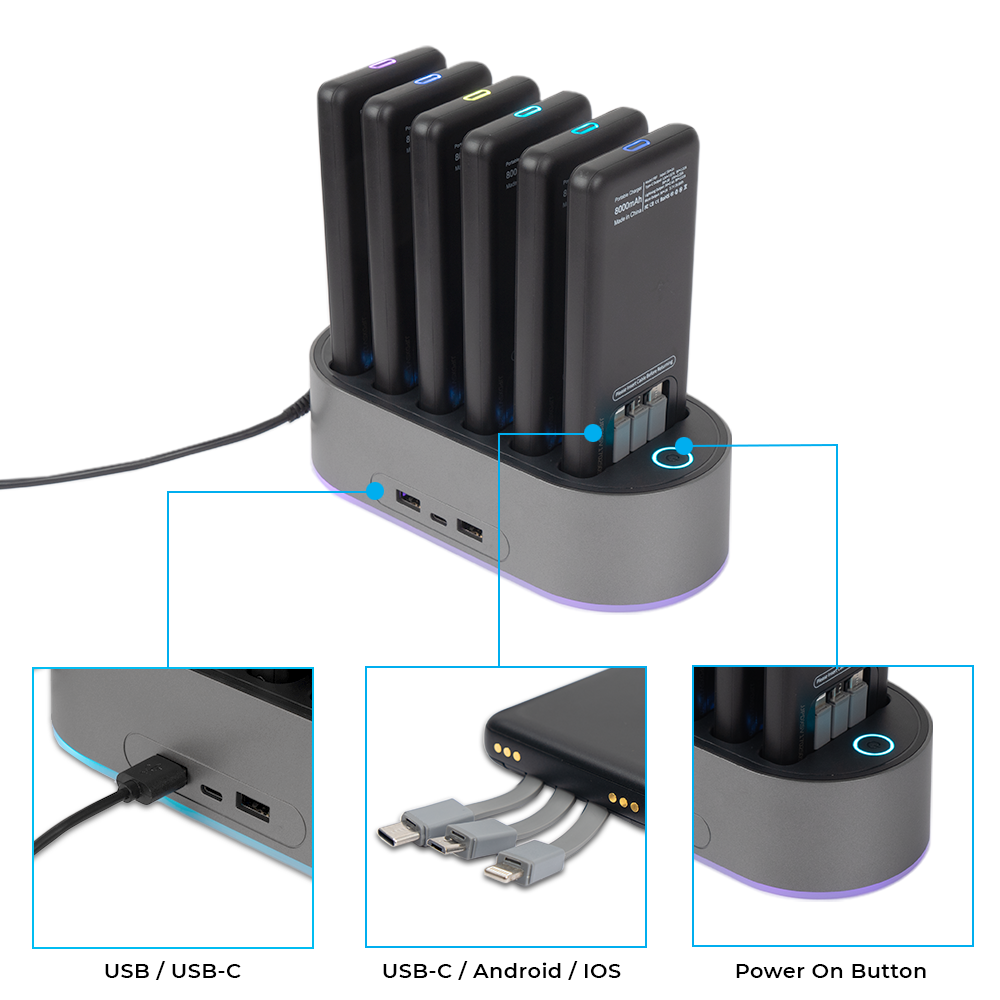 The power bank charging stations, like portable device charger units, allow for multiple devices to be charged simultaneously. Replaceable units ensure continuous operation even during peak usage periods. Hotels, resorts, gyms, hospitals, and clinics benefit from the custom printing capabilities that transform each battery pack into a branded marketing tool. The docking station design protects your units whilst providing customers with freedom of having their device charged on the move.