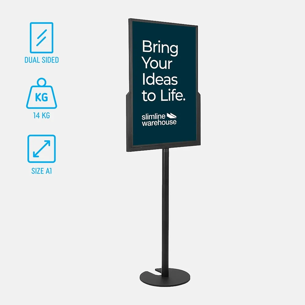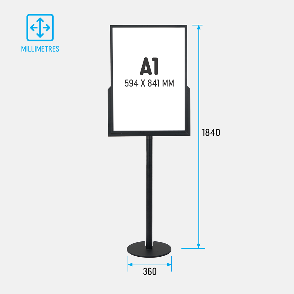 This A1 poster stand helps you advertise and promote at your location, whether in a retail stores, shopping centres, restaurant, exhibition hall, cafe, museum, cinema, and more. This display holds an A1 (841 x 594mm) poster is standard portrait format on each side of the frame. This dual-sided design helps you to maximise available space whilst reaching out to potential customers in multiple directions at once. The frame has a slide-in design that makes it quick to switch out graphics in seconds with no tools needed!