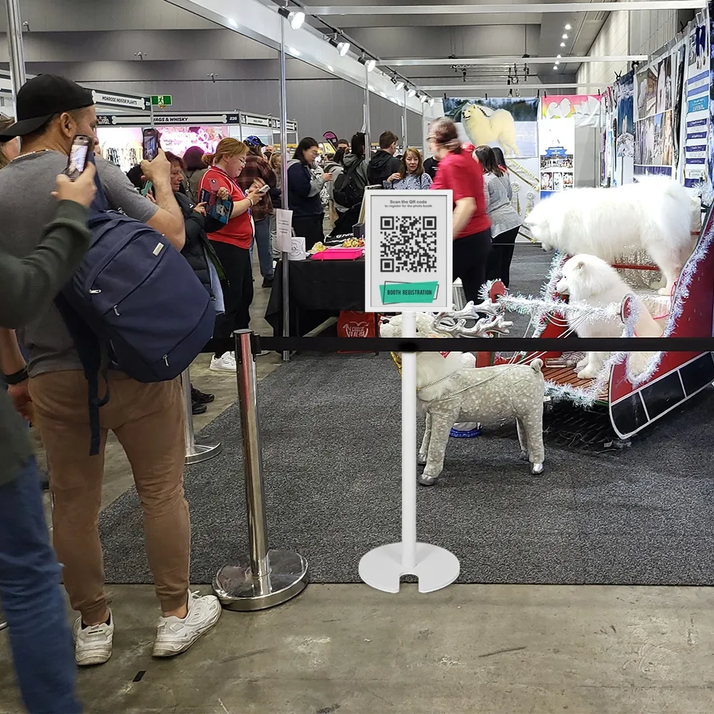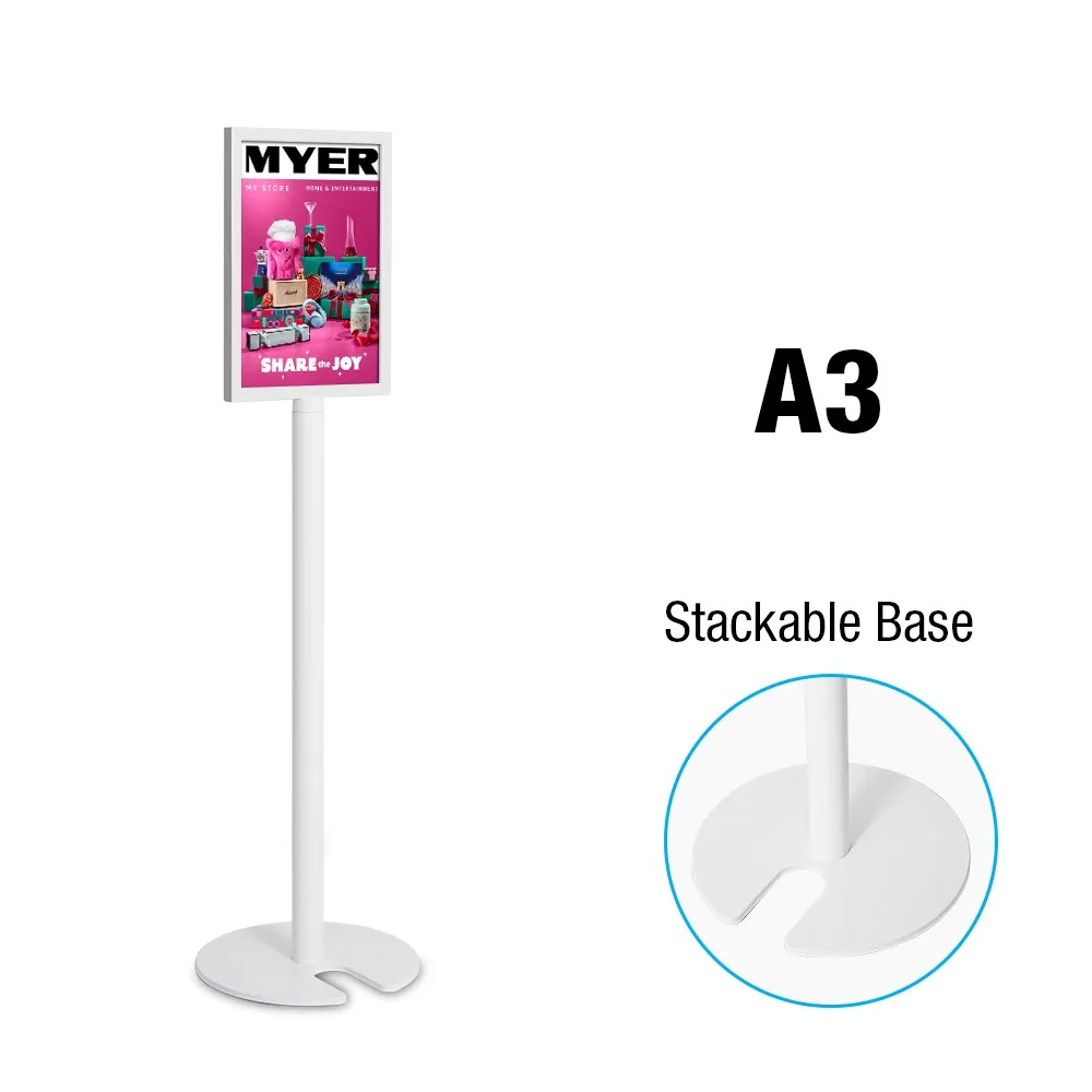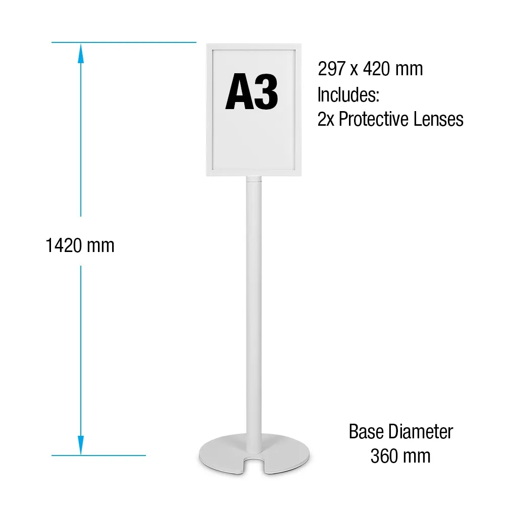 An A3 poster holder, like a freestanding signage stand, comes with 2mm thick acrylic lenses that shield posters from dust, fingerprints, and damage. The 1420mm tall aluminium fixture is built for durability while remaining lightweight for easy repositioning. The 300mm diameter base includes a cut-out for stacking multiple units together, making it a space-efficient storage solution for businesses with rotating signage needs.
