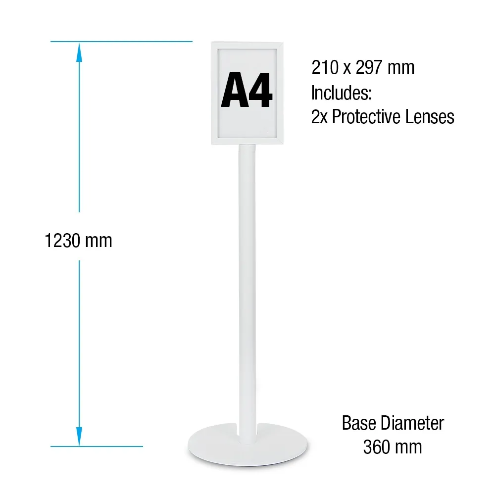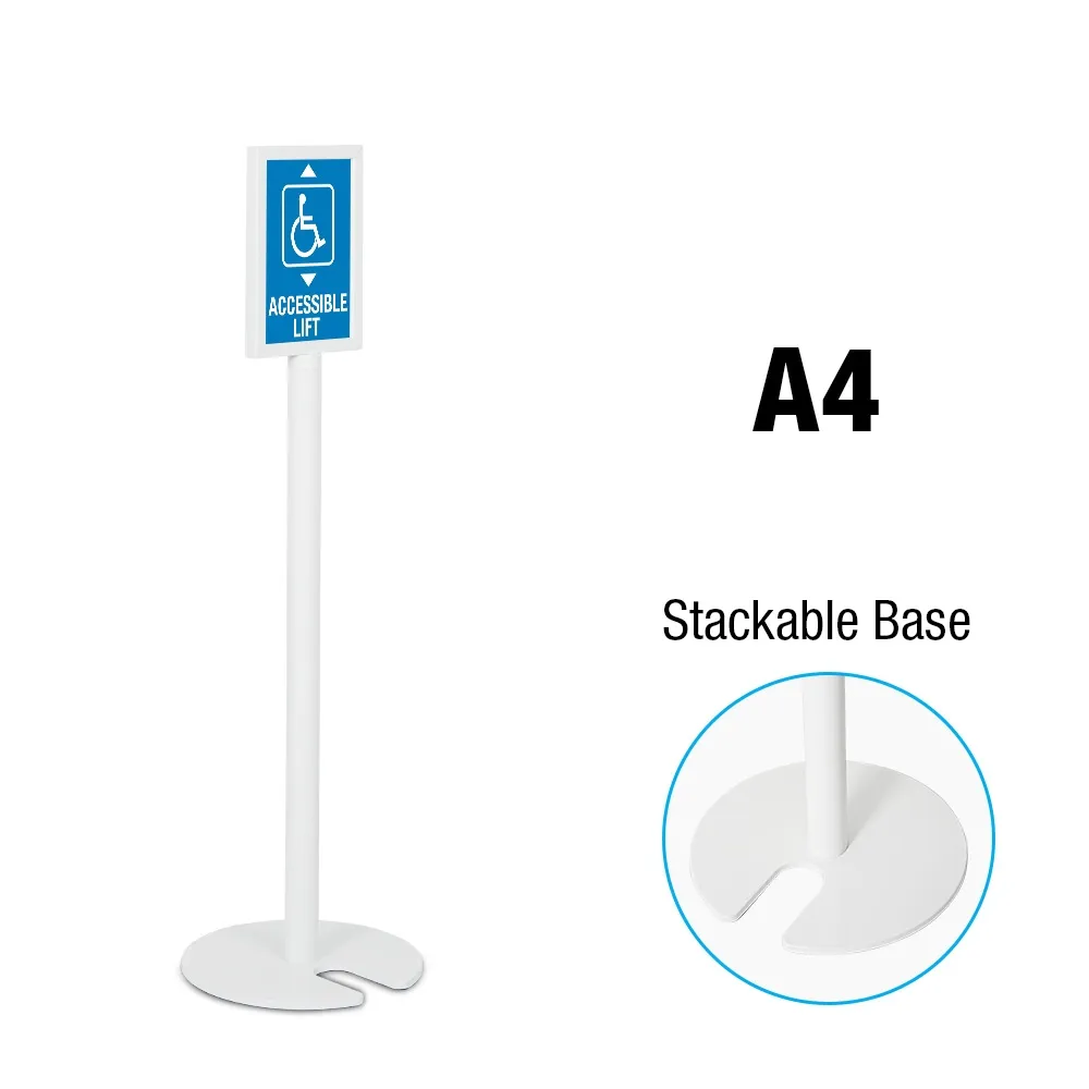 An A4 poster holder, like a freestanding directory stand, includes 2mm thick acrylic lenses that protect posters from dust and damage. The 1230mm tall fixture is made from aluminium to be lightweight and low-cost, allowing businesses on any budget to an effective display that holds up well to regular use in high traffic locations. The 300mm diameter base features a cut-out to allow multiple stands to be stacked together at once to save space in between uses and make transport to and from events simple.