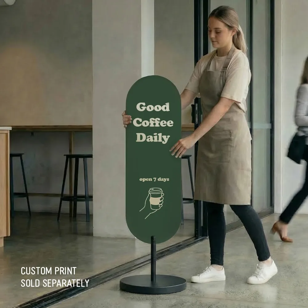 Oval Poster Stand signage provides a clean, modern way to capture attention at entry points. Designed for cafés, bakeries and retail stores, this freestanding oval sign delivers high visibility without blocking foot traffic. The curved edge signage helps promotions, menus and hero products stand out in busy Australian retail and hospitality environments.