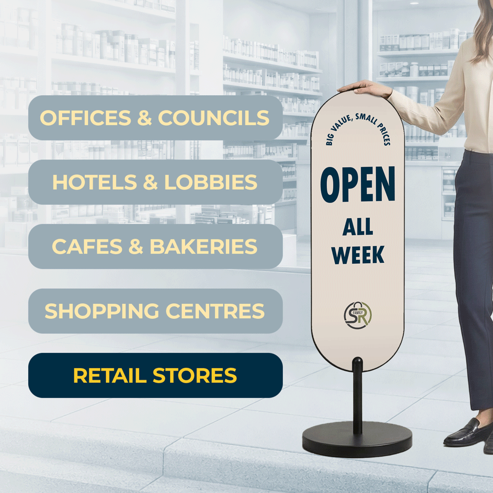 Built for flexibility, this oval wayfinding sign can be repositioned throughout the day as traffic patterns change. Fast setup supports pop-ups, market stalls and rotating promotions. As a portable shop signage solution, it improves walk-in conversion while maintaining a compliant, professional presentation across retail and hospitality settings.