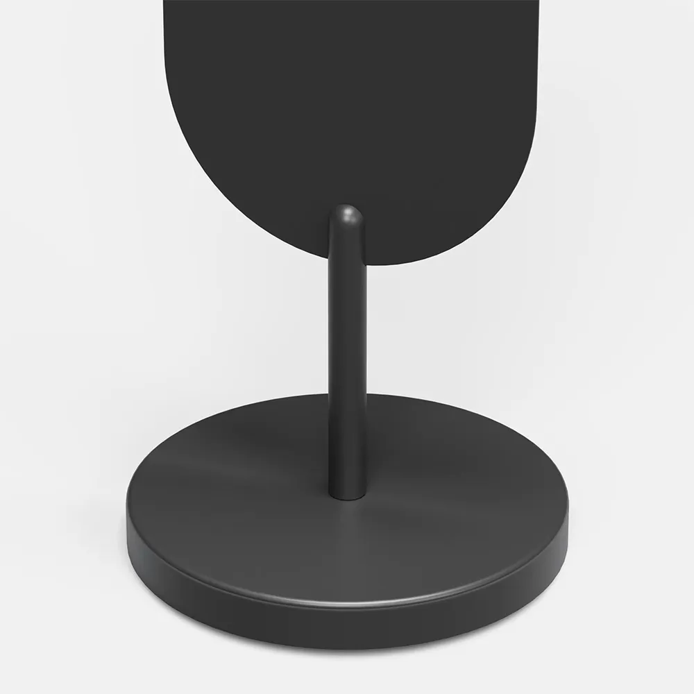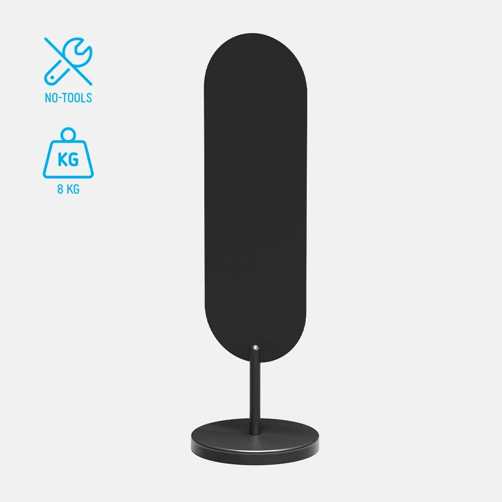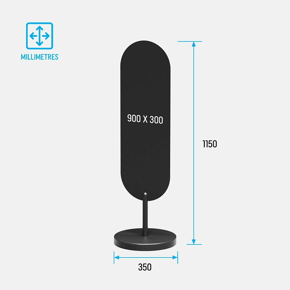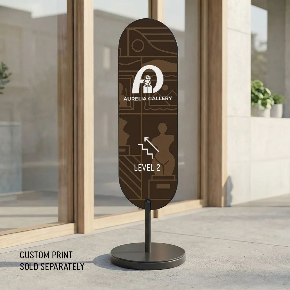 The compact, weighted base keeps access paths clear in shopping centres, malls and shopfronts. This oval branding stand suits locations where permanent signage is not allowed. Powder-coated steel construction supports reliable indoor or outdoor use. The modern oval sign display blends easily with contemporary fit-outs and avoids the visual noise of traditional A-frames.
