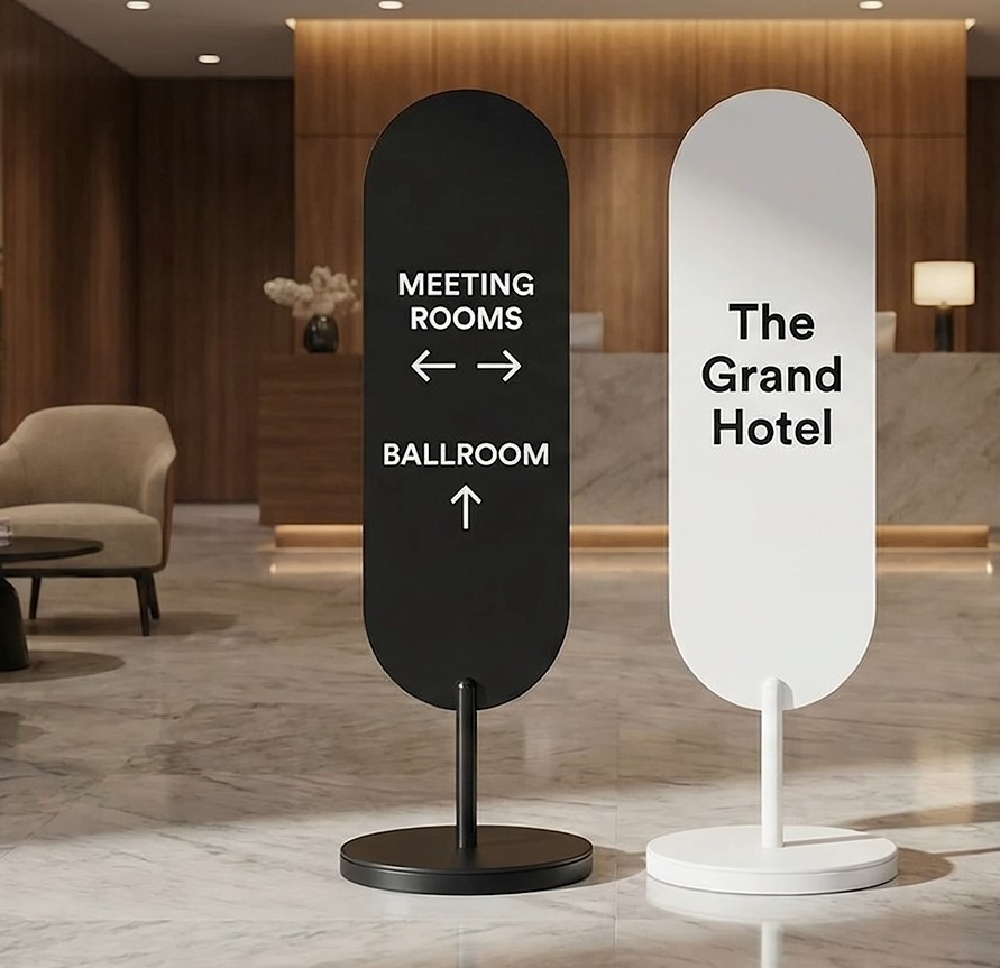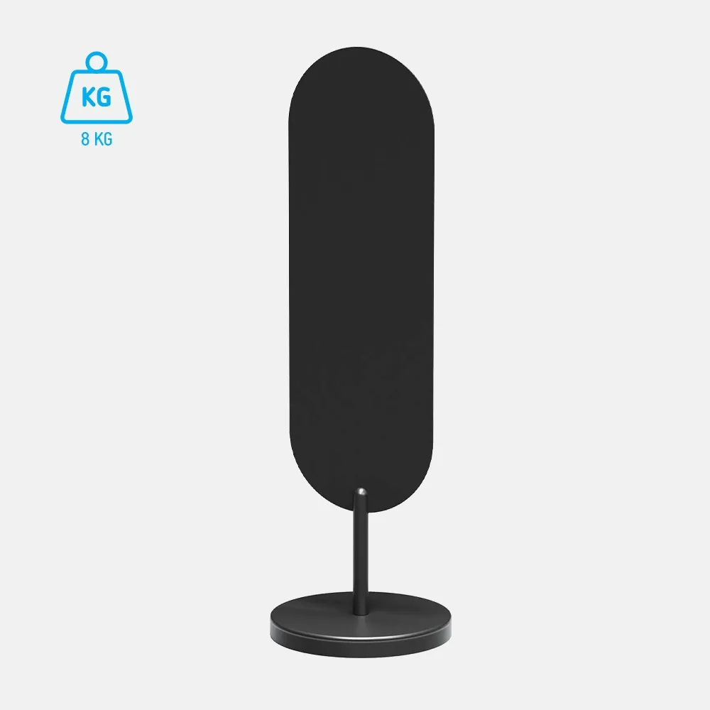 The compact, weighted base keeps access paths clear in shopping centres, malls and shopfronts. This oval branding stand suits locations where permanent signage is not allowed. Powder-coated steel construction supports reliable indoor or outdoor use. The modern oval sign display blends easily with contemporary fit-outs and avoids the visual noise of traditional A-frames.