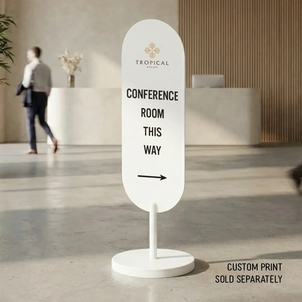 In retail lobbies, shopping centres and shared buildings, this curved freestanding sign supports visitor direction signage without visual clutter. The powder-coated steel frame suits indoor and outdoor use, while the clean form aligns with modern fit-outs. It’s a practical temporary wayfinding solution that improves navigation, flow and customer experience.