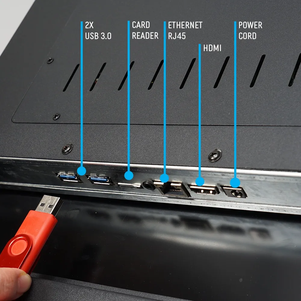 - Rear ports include 2 x USB 3.0, SD card reader, HDMI, Ethernet (RJ45) & power switch