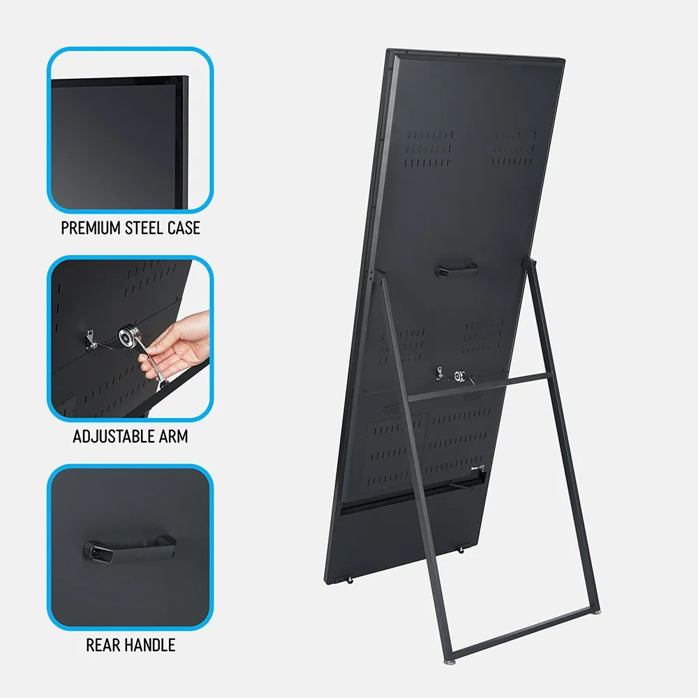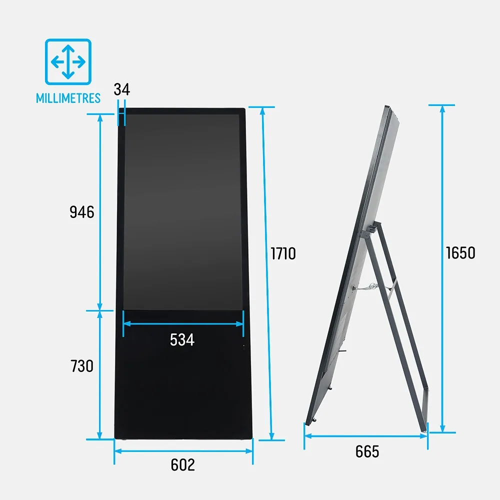 A digital A frame, like floor standing electronic signage, is a commercial grade display designed for long-lasting use in public settings, rated for use up to 18 hours a day of continuous operation. The portable sign has dual 5-watt speakers to include sound in your presentation if desired. The 45kg unit has a built-in handle on the rear of the display to help make moving it into position easier. An adjustable rear arm helps you to angle the unit and ensure it is stable during setup. When fully setup, this display measures 603.4 x 1647.5 x 590mm overall, with the rear legs including suction cups to help keep them in place.