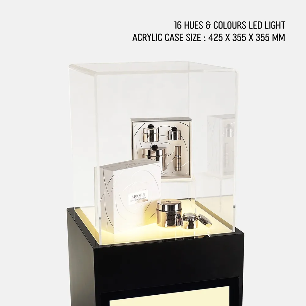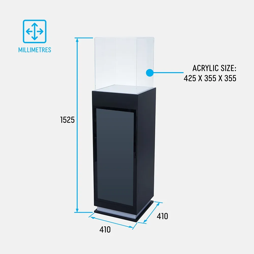 The display cube pedestal, like retail plinth, includes an acrylic top that helps protect the on display items from gathering dust and unwanted tampering. The 1525mm tall plinth has a 410 x 410mm area atop the unit, with the clear acrylic cover allowing for items up to 430mm in total height to fit within. This unique display also has LEDs built into both the top of the unit and a strip around the base to match colour and draw even more attention. A remote control is provided to manage the colour effect and have it enhance your displayed items.