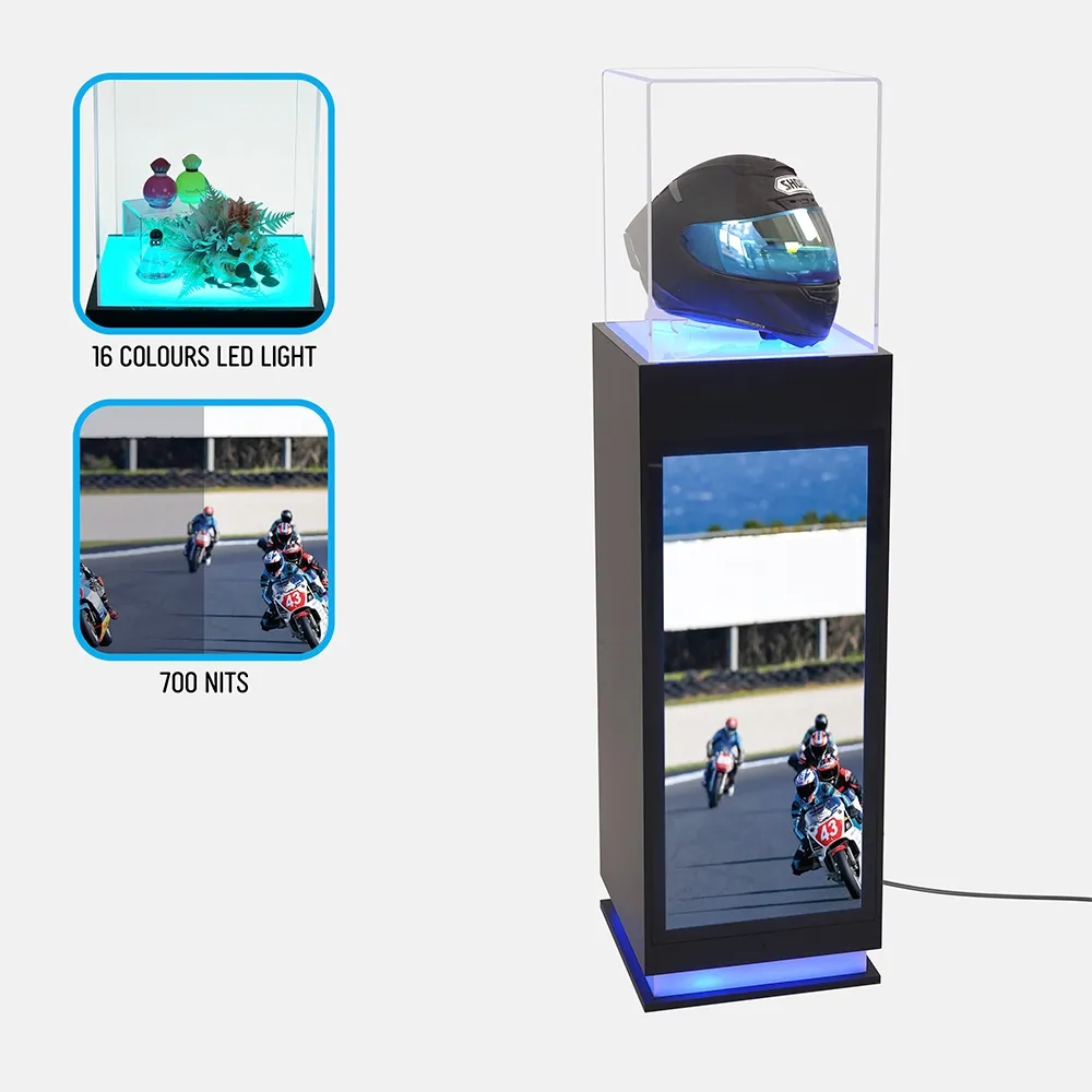 This display cube pedestal integrates a digital signage screen with a plinth to create an eye-catching marketing display! The plinth has a 34” non-touch screen on the front, perfect for displaying interactive presentations and branded graphics that can promote items on display and give additional information. This screen is equipped with an Android® 11 operating system for content management, allowing a variety of media including images, videos, and audio across many formats. The screen full HD resolution of 1080 x 3840 and brightness rating of 700 nits ensures vibrant, sharp visuals that stand out in high-traffic areas. Content can be uploaded via Wi-Fi, USB drive, Ethernet, or cloud-based software, making remote updates easy to manage from anywhere. The commercial-grade display has 32GB of internal storage and 2GB RAM powered by a quad-core RK3568 CPU for smooth playback and a wide 178° viewing angle.