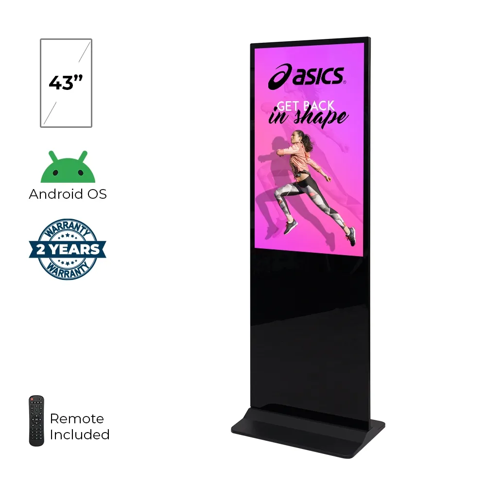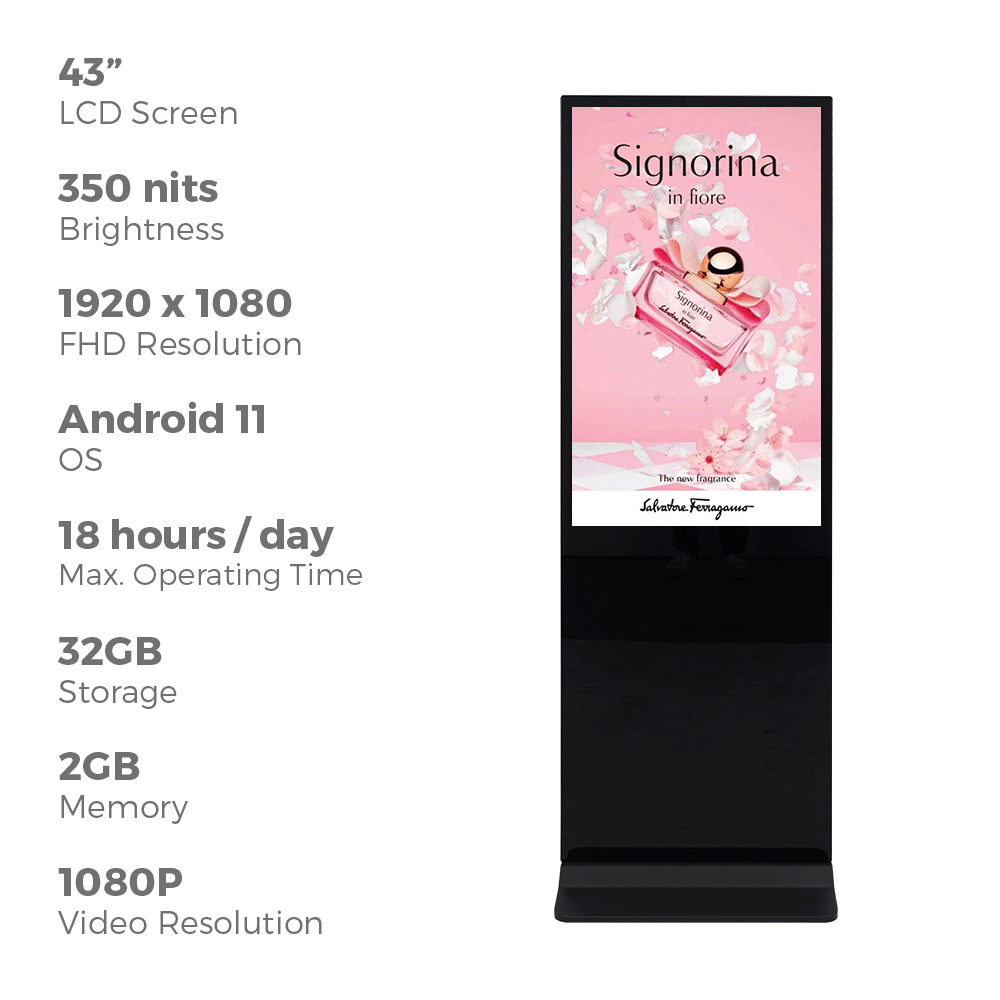- Digital display totem has 43” screen with 1080p full HD resolution for vibrant content