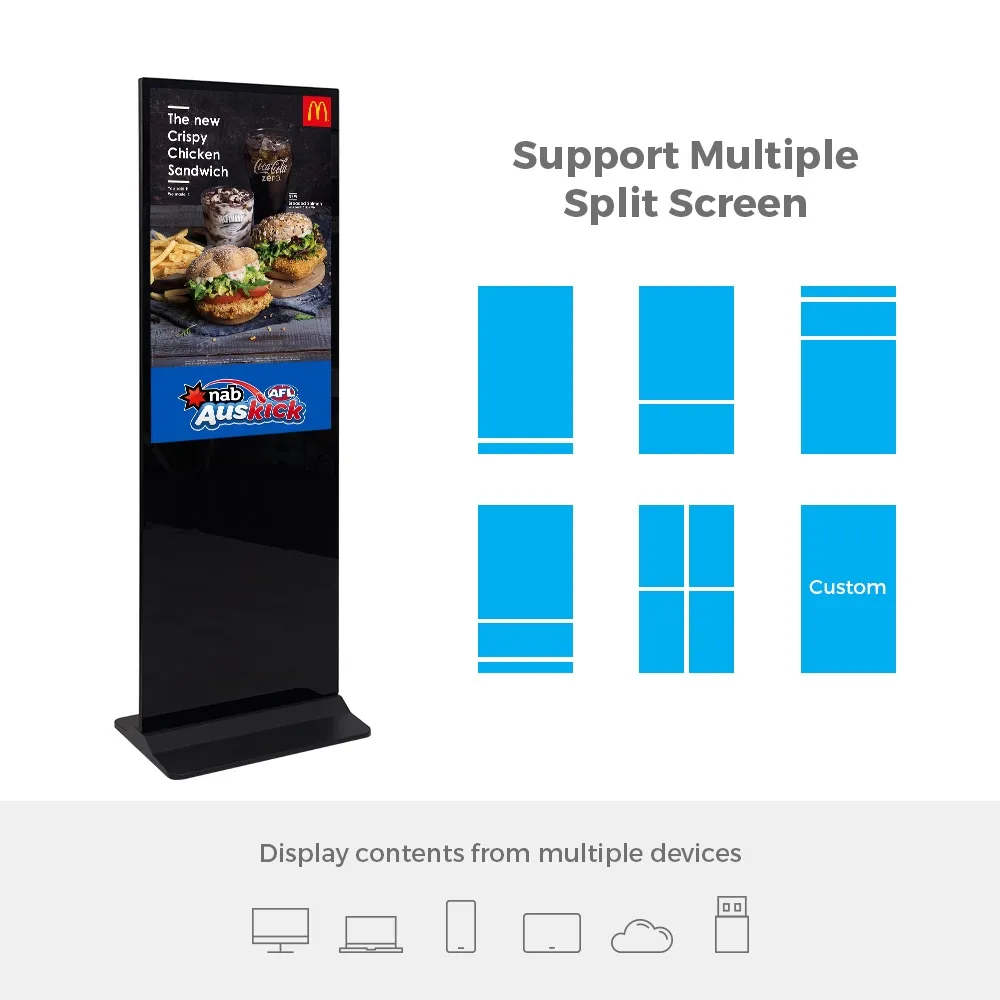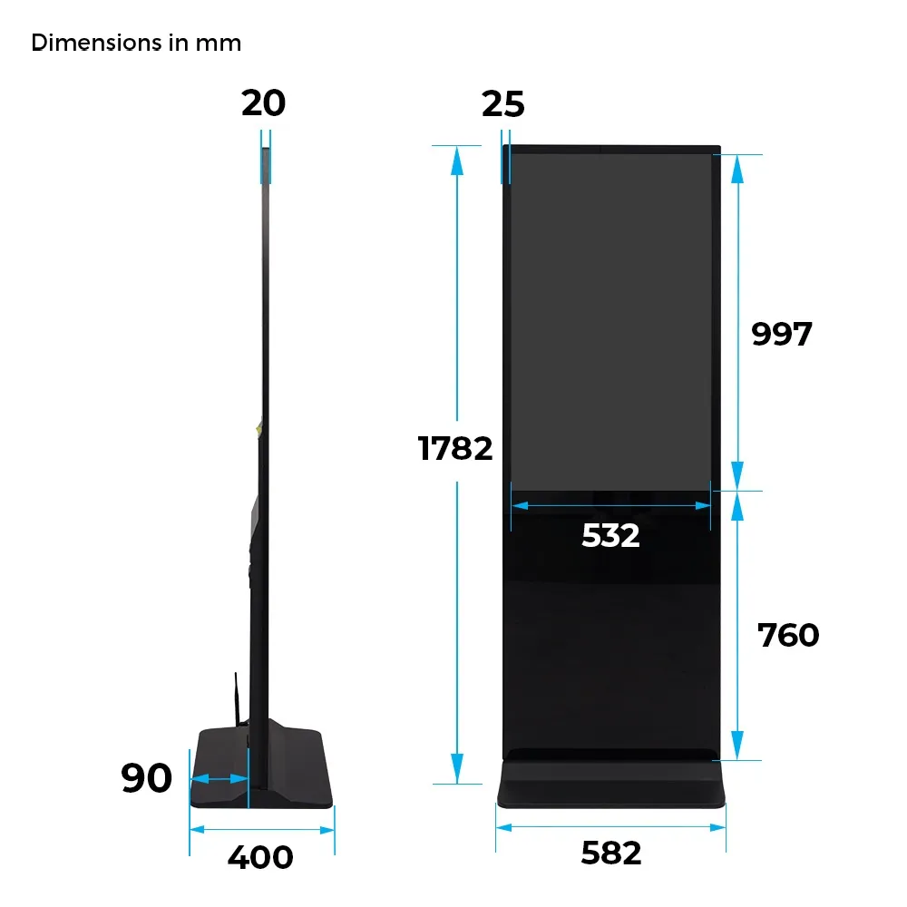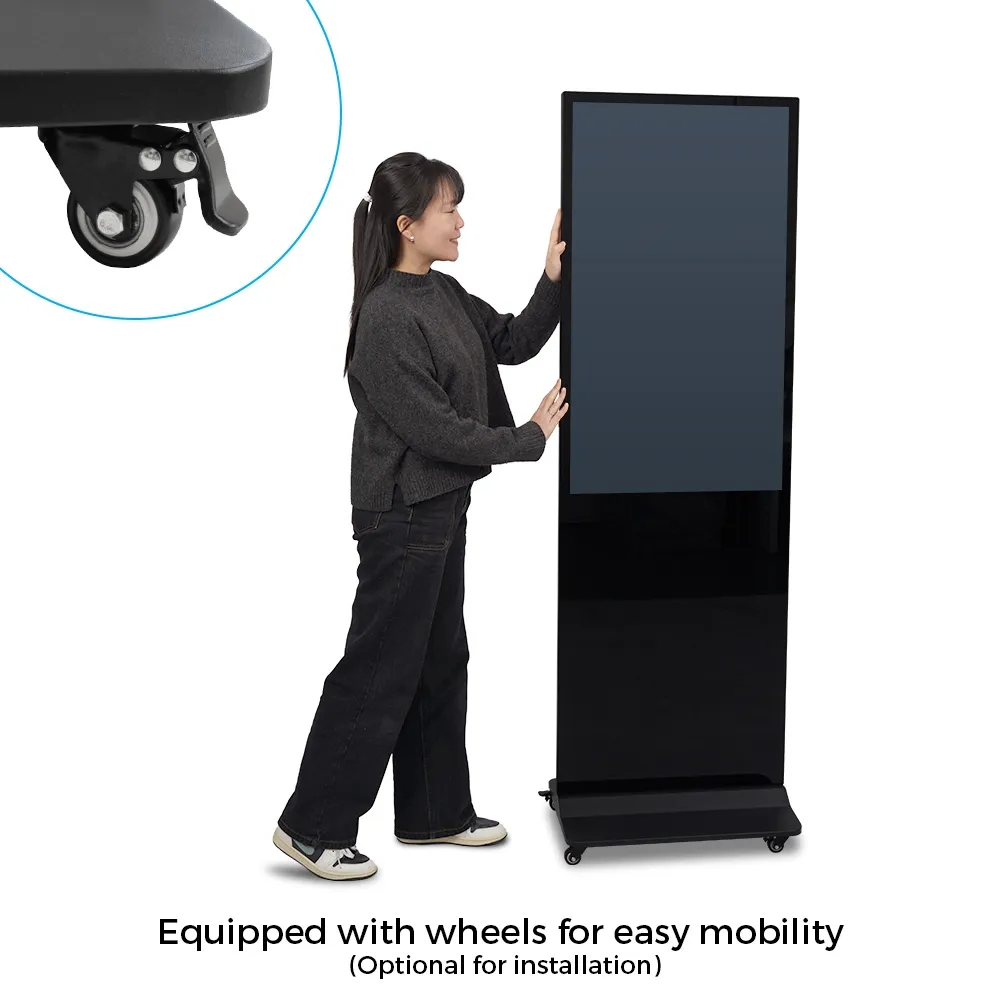 This floor standing signage display features a sleek black finish that blends seamlessly into modern environments. The steel base offers outstanding stability and holds most of the 39.6kg weight. A 3m power cord allows flexibility in placement and easily reaches outlets. Order online today for quick shipping Australia-wide from Slimline Warehouse to start promoting your brand with a professional, eye-catching digital solution built for retail and commercial use.