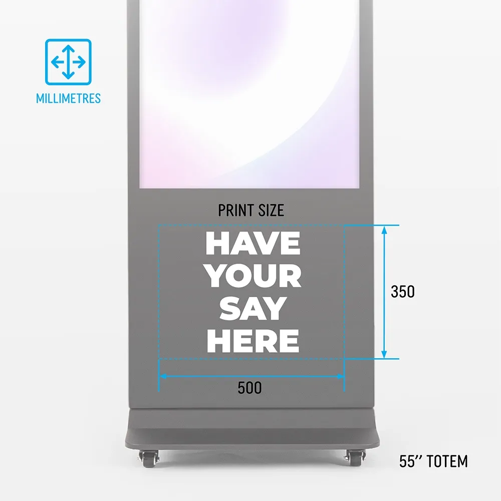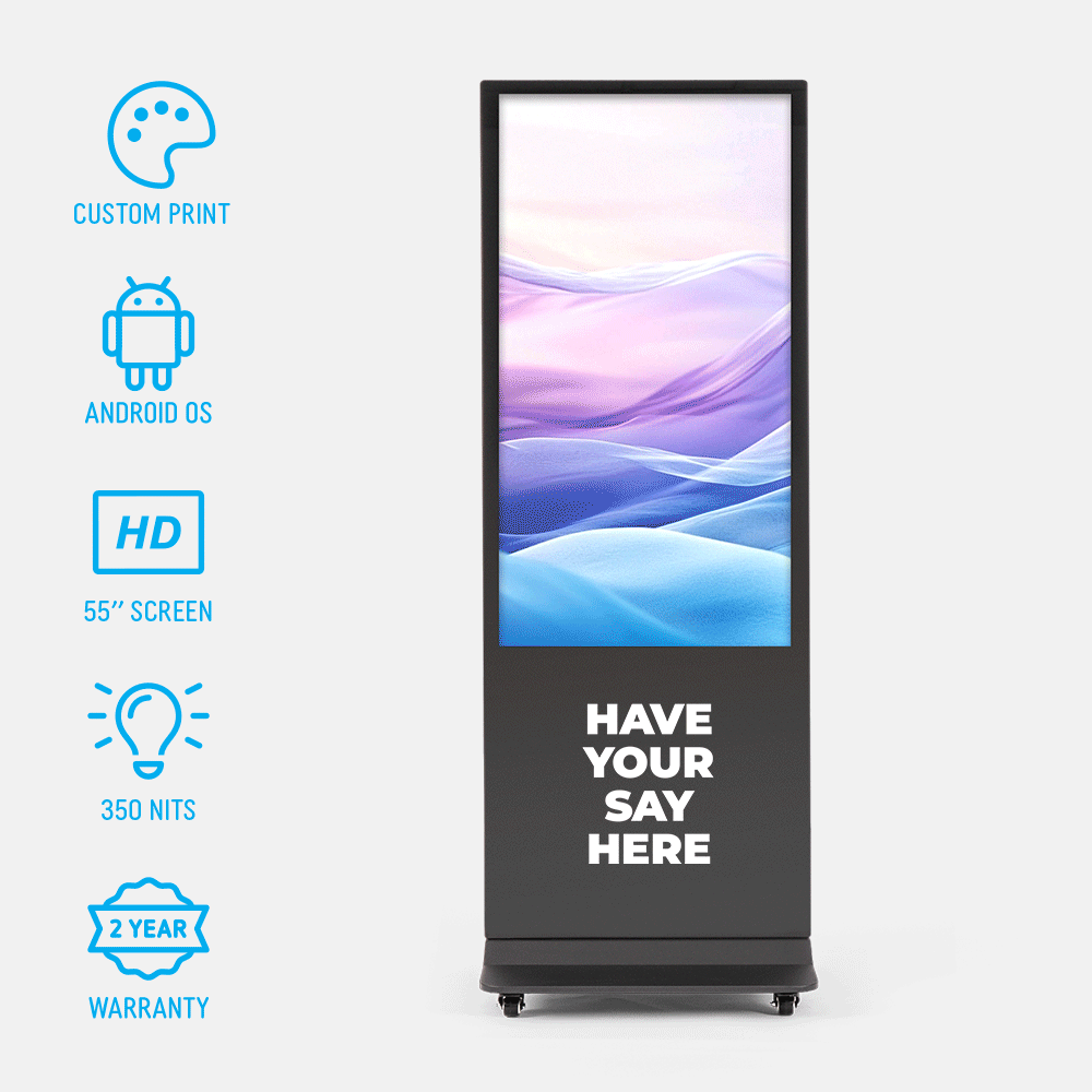 Designed for long-term operation, the 55 inch Dline digital signage totem combines digital content with permanent printed branding to deliver a polished, high-visibility communication solution.