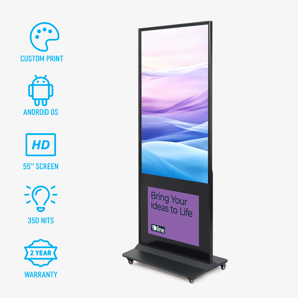 The 55 inch Dline digital signage totem combines digital content with permanent branding to deliver a reliable, polished communication solution.